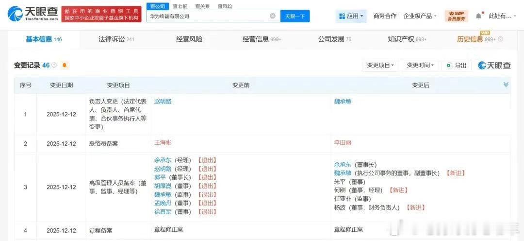孟晚舟卸任华为终端公司董事 余承东又升职了!华为终端公司发生工商变更,郭平卸任董事长,由余承东接任,孟晚舟、徐直军等卸任董事。余承东华为