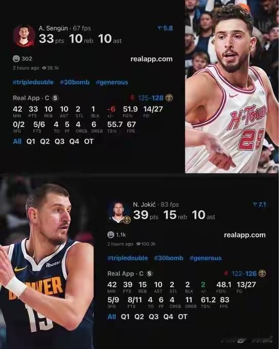 前偶像看起,我前几天还在说申京就是年轻版约基奇,今天掘金对阵火箭,两个人都拿到30+三双,这应该是NBA历史首次两个中锋打出这样的数据吧! 目前约基奇场均29.8分12.8篮板10.8助攻1.4抢断0.8盖帽。 申京场均23.5分9.4篮板7.1助攻1.5抢断1盖帽。 虽然现在老鹰的约翰逊数据更接近约基奇,但他是小前锋,可以说约翰逊是詹姆斯的年轻版,但申京真的是约基奇年轻版,只是他们两人只相差七岁而已。