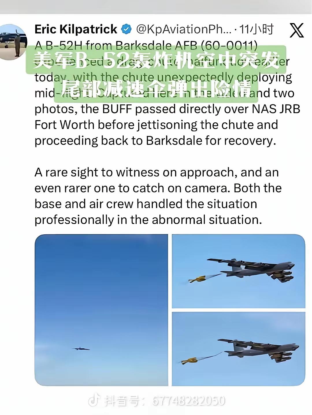 有图有真相?近日刷到有国内自媒体博主说,12月11日美日联合军演时B-52遭不明目标锁定,慌乱中本想发射干扰弹,结果误射出减速伞,后狼狈撤离! 这则消息引起网友们的热议,不过至今没有任何官方通报,有网友质疑是假消息,也有网友力挺应该是真的,现在国外博主也议论纷纷,还发出一张美军B-52射出减速伞的照片。但图片中英文翻译成中文看得范迷糊,不知道是不是现场照片。 个人认为,这事如果是真的,美日官方也不好意思通报呀,总不能说这是B-52在测试减速伞的兜风能力吧![捂脸] 大家怎么看,欢迎评论区留言讨论。