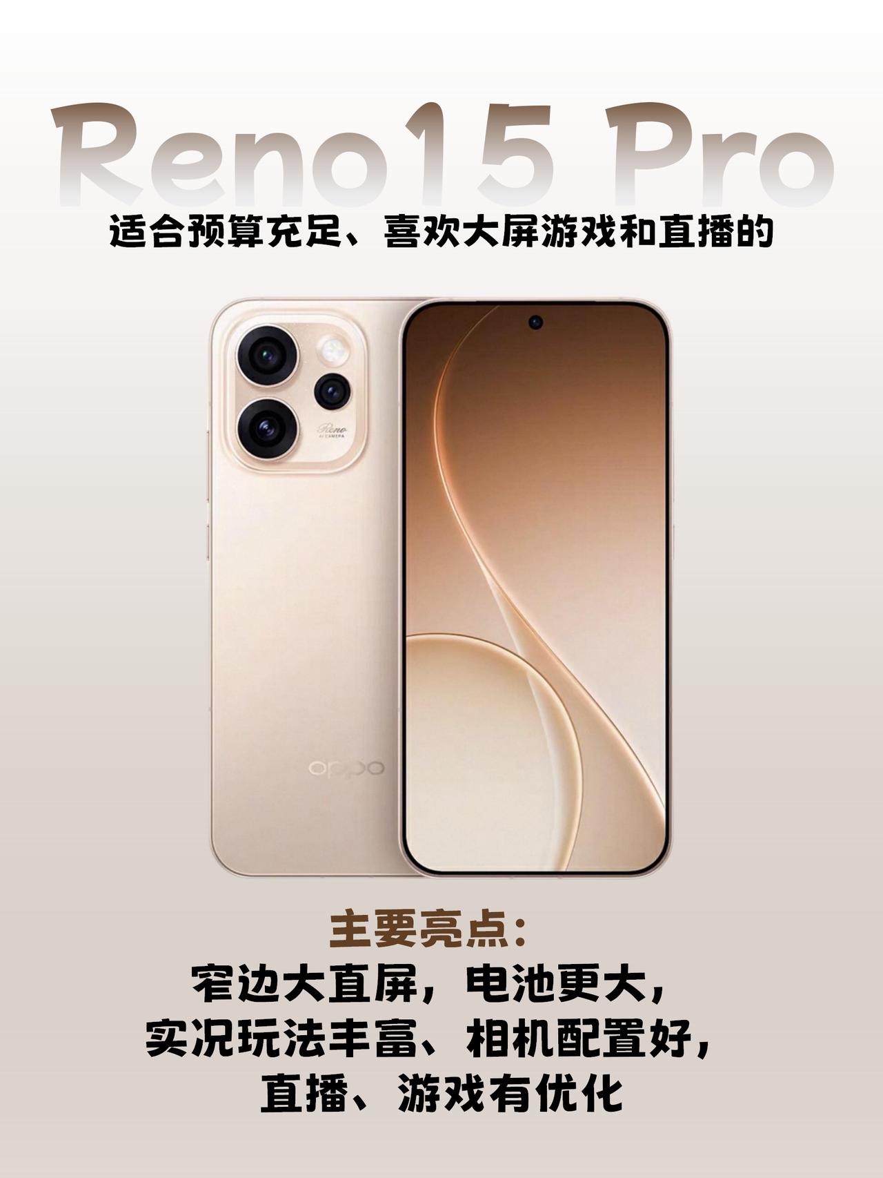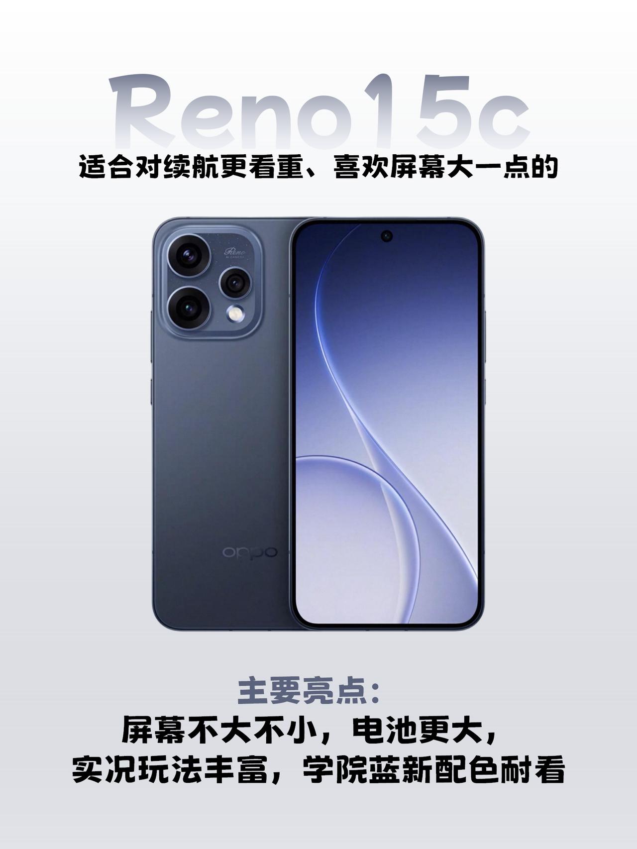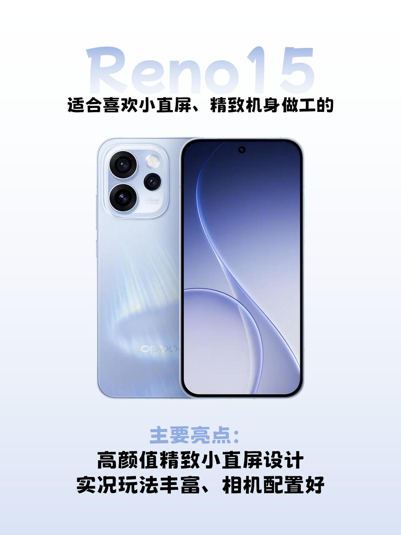 年底购机盘点!看看Reno15系列哪款适合你? 年底了打算换手机的宝子不少 最近很火的OPPO Reno15系列 估计有不少宝子在看吧在纠结吧? 三周内全渠道出货量突破200万台,火是真的火啊 只不过Reno15系列,加上新出的Reno15c一共三款型号 这里帮大家解析一波怎么选! 📱Reno15 基础款是6.32英寸小屏,主打的2亿像素、出圈实况等拍照功能都有,游戏也有超帧超画提升体验,适合大部分人,如果你没有特殊需求,选这款就行了 📱Reno15c 这款是6.59英寸屏幕,手感适中,主要的拍照功能跟其它两款一样是都有的,主要是换上了骁龙芯片,日常使用流畅省电,如果你喜欢这个不大不小的屏幕,这款确实还不错 📱Reno15 Pro Pro款是6.78英寸大屏,更适合喜欢大屏幕的宝子,6500mAh电池也比基础款的要大一些,而且还优化了直播功能,平时有直播的宝子选这款体验更好,第五人格游戏也有高帧适配,适合喜欢玩这类手游的宝子 总体来看,这三款配置都挺不错的,销量高是有道理的呀~ 大家按照自己的需求来选就行了,建议入手前先去线下试试,看看尺寸大小合不合适先~