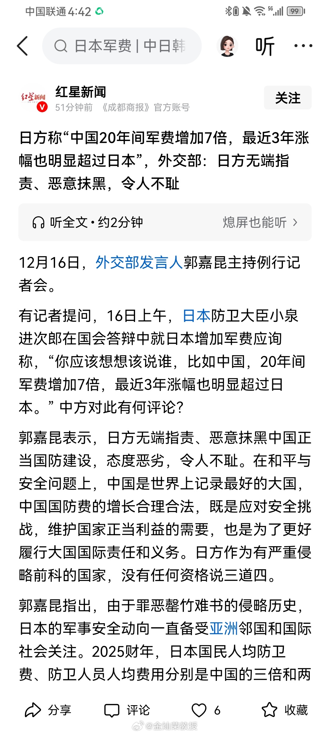 中国国防开支是为了维护世界和平,保护二战成果,开支再大都是合法合理合情的。日本军费开支是为军国主义复活。