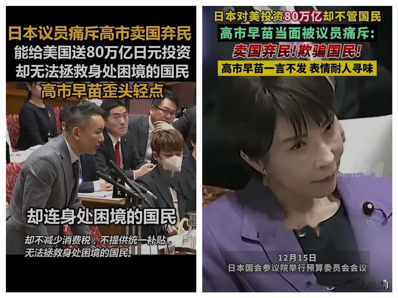 名场面来了!日本议员山本太郎在国会上指着鼻子骂:宁愿拿80万亿去“孝敬”美国,也不给自家国民降税发补贴,这不是卖国弃民吗? 这回高市早苗算是彻底演砸了,这大概就是所谓的“求锤得锤”。 中日纷争这才一个多月,中国的一套组合拳下来,日本就开始不好受了,汇率崩了,日债收益也乱套了,国内通胀率都飙到了3%,老百姓日子越来越紧巴了。 最逗的是高市早苗一直歪着头,表情耐人寻味,终于咬牙切齿挤出一句“谢谢提问”,隔着屏幕都知道她憋着一肚子的怨恨! 紧接着又被拷问,为什么不按首相团队提前写好的台海材料稿子念,非要瞎发挥?就连他们的外相想玩文字游戏糊弄事儿,都被咱们外交部郭嘉昆一语道破,别在那“挤牙膏”想蒙混过关。 外有特朗普的高关税大棒,内有在野党天天找茬,这下我看她是真没招了! 高市早苗国会现场遭痛斥:卖国弃民 日议员斥日美贸易协定:卖国弃民