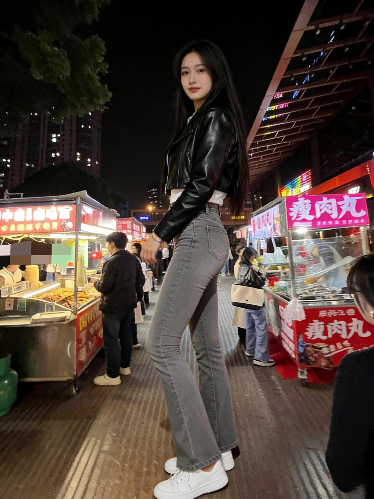 夜市霓虹照客身,长街烟火惹芳尘。 黑裘裁就凌风态,灰裤妆成袅娜身。 发漫鬓边凝暮色,眸回巷口动星轮。 人间烟火三千处,独立亭亭自不群。
