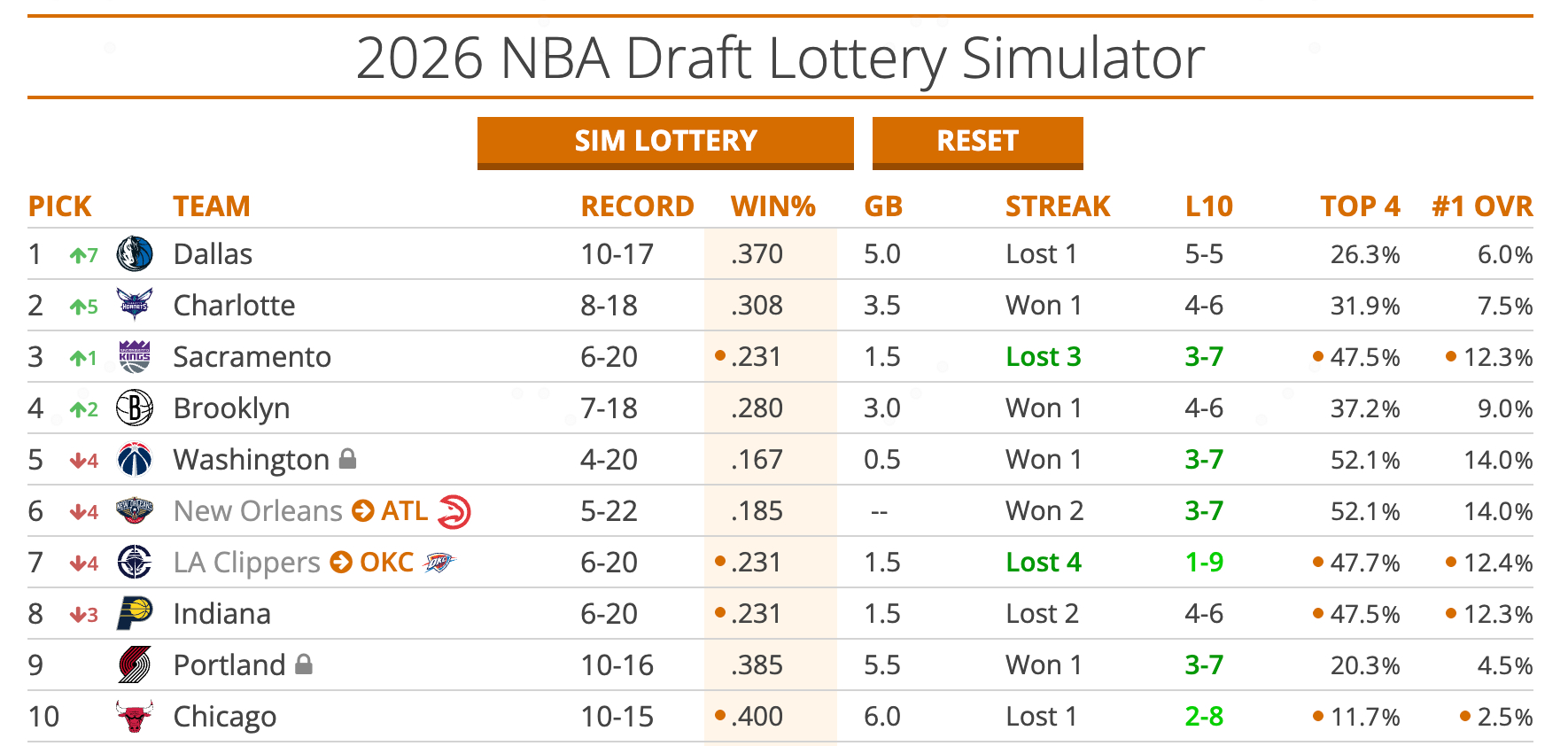 今天输球之后独行侠跌到西部第 12,本赛季 tankathon 第一抽。NBA常规赛