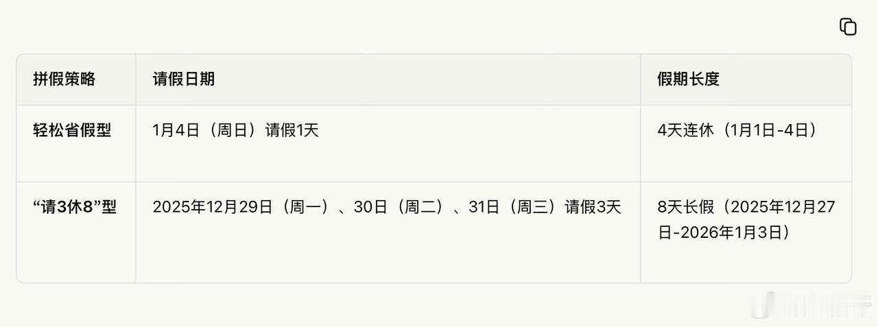 元旦请3休8火出圈,打工人的超长假期狂欢来了,眼看着2025年就要收尾,2026年元旦的脚步越来越近,最近社交平台上最火的话题莫过于“元旦请3休8”了,打工人的朋友圈几乎被这份拼假攻略刷屏,点赞评论区全是满满的心动信号。 可能还有朋友没搞懂这波操作的精髓,其实特别简单。根据官方放假安排,2026年元旦是1月1日到3日放假调休,1月4日周日上班,而2025年12月27日、28日本来就是周末。只要在12月29日、30日、31日这三天请年假,就能把前后的周末和元旦假期无缝衔接起来,从12月27日一直休息到1月3日,足足八天的超长假期就到手了。用三天年假撬动八天休息,这种“以少换多”的拼假技巧,难怪能让大家瞬间沸腾。 这波拼假热潮一起来,大家的反应可太真实了。办公室里、闺蜜群里,到处都在讨论这件事。不少行动力强的朋友已经开始行动,打开12306查火车票,盯着旅游APP订酒店,东北的雪乡、海南的海岛、云南的古城都成了热门目的地,就等着放假开启一场说走就走的旅行。还有些人打算趁着这八天彻底放松,宅家补觉、刷完攒了一年的剧,或者回老家陪爸妈备年货,慢悠悠享受生活。 不过热闹归热闹,也有不少人犯了难。年底正是公司冲业绩、收尾工作的时候,有些岗位根本离不开人,想请假又怕影响工作进度。还有人看着自己的年假余额犯愁,一下子用掉三天,后面有事就不够用了。更有网友调侃“拼假一时爽,节后火葬场”,想到休完回来要连着上六天班,就有点打退堂鼓。 其实“请3休8”能这么火,本质上是戳中了大家对休息的渴望。平时工作节奏快、压力大,难得有机会拥有一段不被打扰的长假,不管是出门旅行还是宅家放松,都是对自己一整年辛苦的犒劳。而且现在政策也鼓励大家合理使用带薪年假,不少企业也越来越人性化,只要提前沟通好工作交接,很多领导都会批准这样的拼假申请。 提醒打算拼假的朋友,订车票要赶早,按照铁路预售期规则,热门线路的车票很容易秒光,记得提前设置提醒。出行的话尽量错峰,避开12月31日和1月1日的出行高峰,能少不少拥堵。如果年假不够,也可以看看公司能不能用调休抵扣,提前和HR确认好规则。 不管最后能不能成功拼假,元旦假期都是新一年的好开端。能休八天固然开心,就算只能休三天,也能好好放松一下。毕竟假期的意义不在于长短,而在于能暂时逃离忙碌,给自己充充电。你准备好请3休8了吗?快来分享你的假期计划吧! 来源:苏澈呀