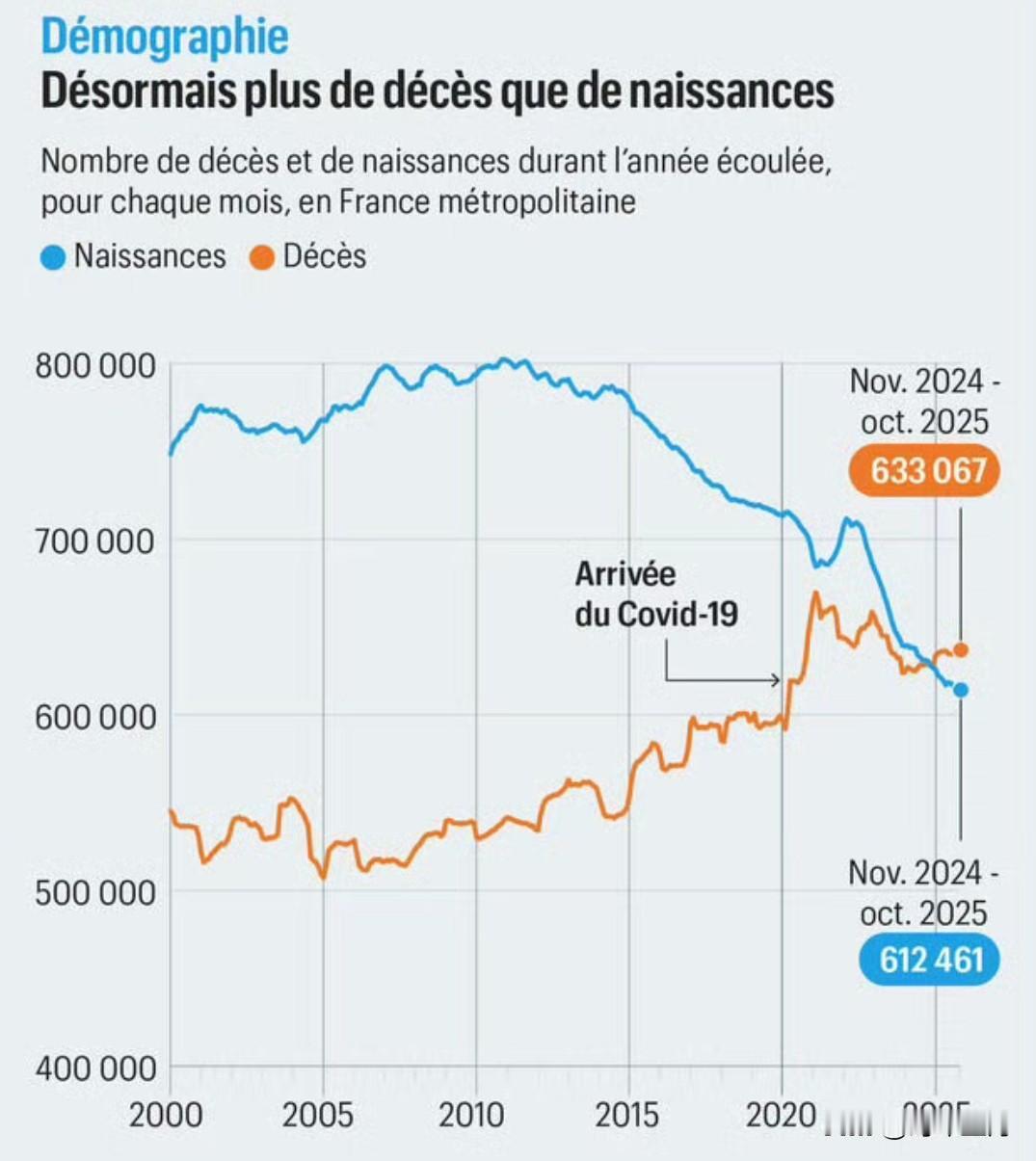 据法国国家人口研究所(Ined)统计,法国自第二次世界大战以来首次出现死亡人数多于出生人数的情况。原本预计在2035年才会出现的人口“交叉点”提前了十年到来,主要原因是出生人数快速下降,以及婴儿潮一代步入高死亡率年龄阶段。 过去15年间,法国每年的出生人数从约80万下降到接近60万,平均生育率降至每名女性1.6个孩子。Ined的研究还显示,30岁以下人群的理想子女数也比以往更少。
