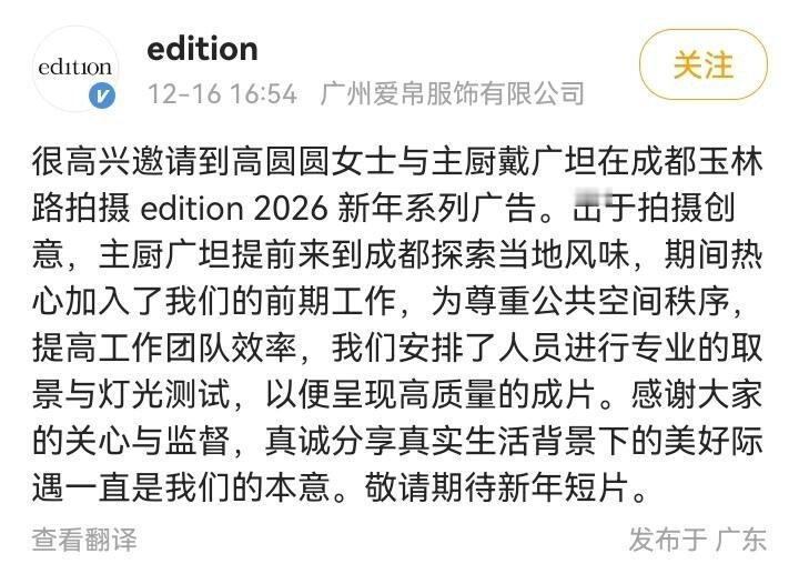 品牌方回应高圆圆录综艺用替身原来高圆圆拍的不是综艺是广告,品牌方回应:“很高兴邀请到高圆圆女士拍摄edition 2026新年系列广告。为尊重公共空间秩序,提高工作团队效率,我们安排了人员进行专业的取景与灯光测试,以便呈现高质量的成片。”说实话光替这个事,社会上多了就业岗位,替身拿到了工资,品牌方不用多花钱买明星的时间,明星节省了时间有更好的演出状态,这就是四赢的事,也没什么吧,再退一万步说,这光替和踩点也差不了多少那牛马开会前话筒啥的还会给领导调好呢,拍照也得先看好角度,拍广告用光替很正常吧。。