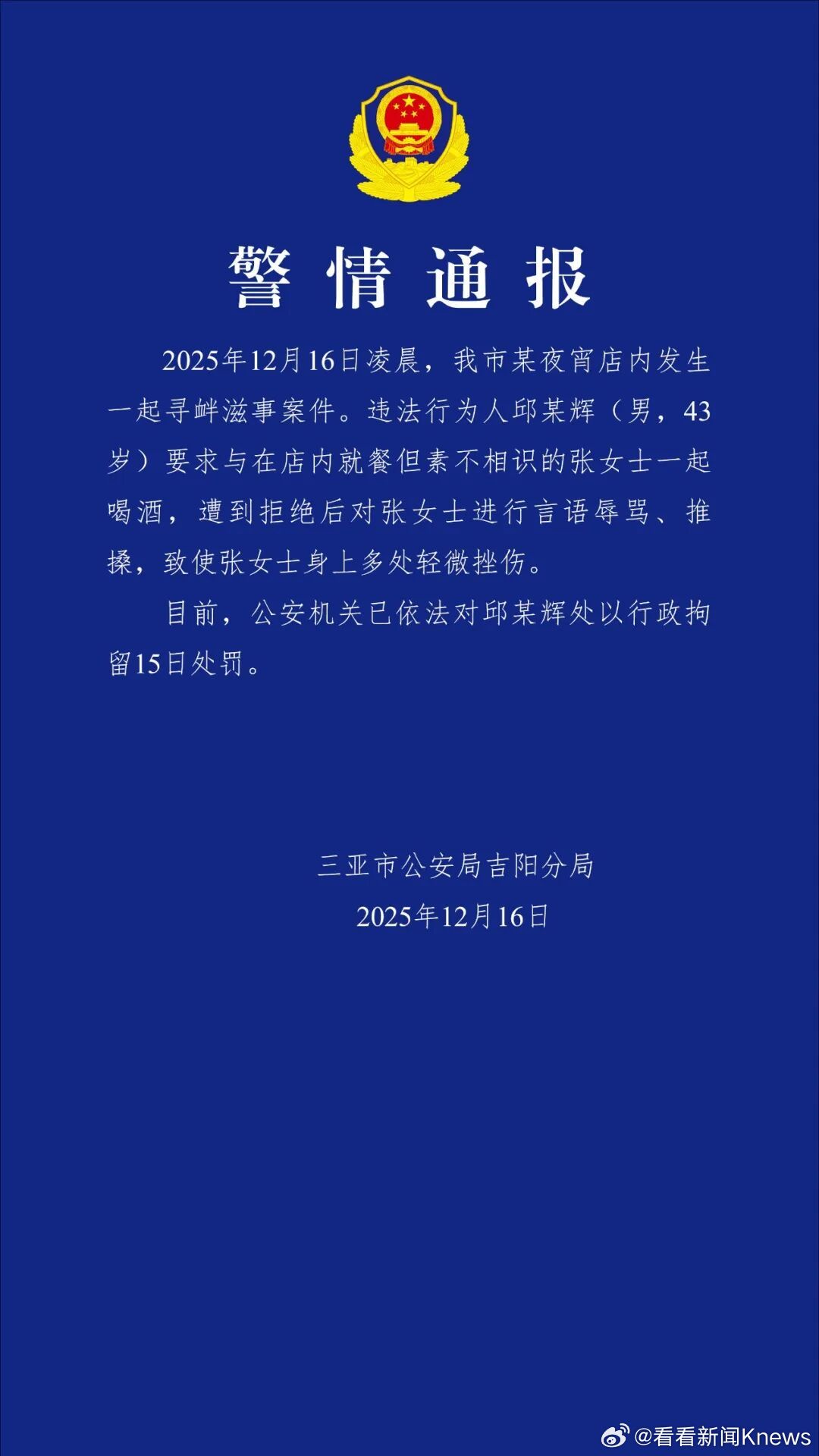 【#警方通报女子吃夜宵拒绝搭讪被打# 邱某辉行拘15日】12月16日,三亚警方发布警情通报:2025年12月16日凌晨,我市某夜宵店内发生一起寻衅滋事案件。违法行为人邱某辉(男,43岁)要求与在店内就餐但素不相识的张女士一起喝酒,遭到拒绝后对张女士进行言语辱骂、推搡,致使张女士身上多处轻微挫伤。目前,公安机关已依法对邱某辉处以行政拘留15日处罚