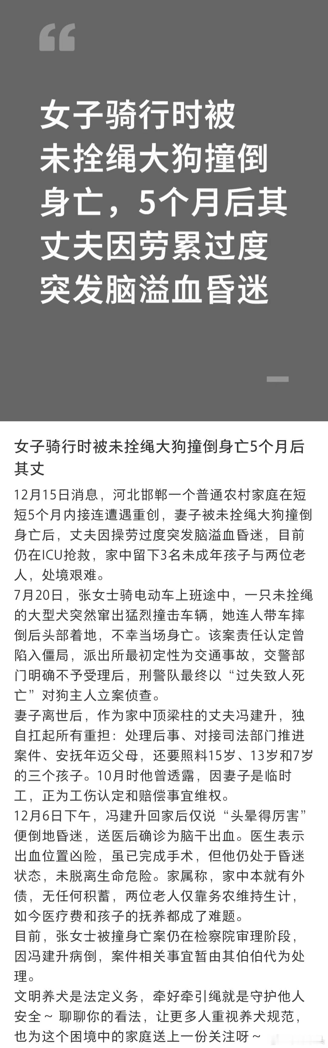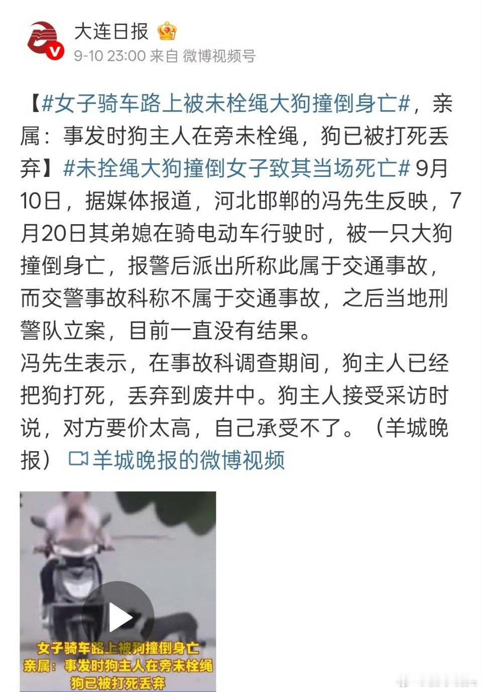 女子被大狗撞倒身亡丈夫住进ICU这条狗是有主人的,狗主为了逃脱责任,直接把狗给打死了。不过狗主刑事责任还是逃不掉的。就是赔偿方面,应该很难要到赔偿。对于流浪动物要及时清理,对于宠物必须要严格管理。不能为了少数人的伪善,将大多数人置于危险之中,要防患于未然。