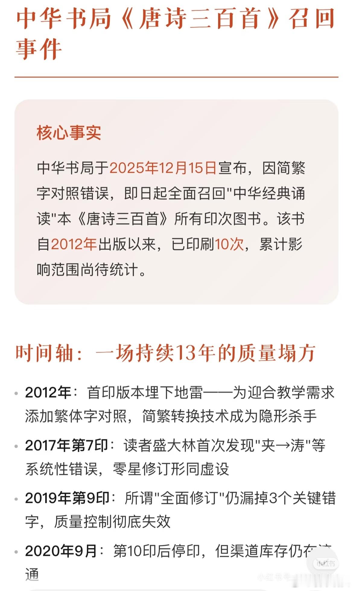中华书局下架召回唐诗三百首还是那句话,文化工作者要有文化。中华书局可以说是出版传统文化类书籍的老字号,就是这样的金字招牌,竟然会出现如此低级的错误。