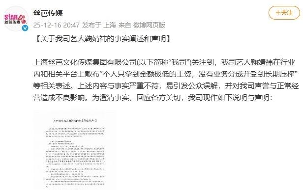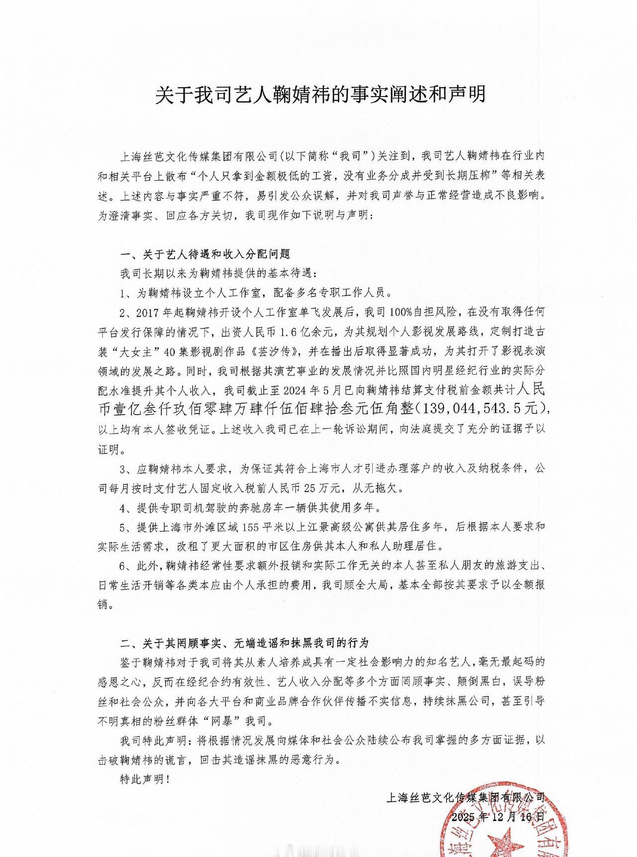 丝芭再回应:我司艺人鞠婧祎在行业内和相关平台上散布“个人只拿到金额极低的工资,没有业务分成并受到长期压榨”等相关表述与事实严重不符,并罗列了为鞠婧祎提供的基本待遇…丝芭为鞠婧祎提供的基本待遇