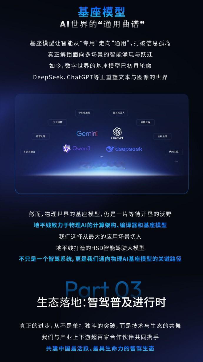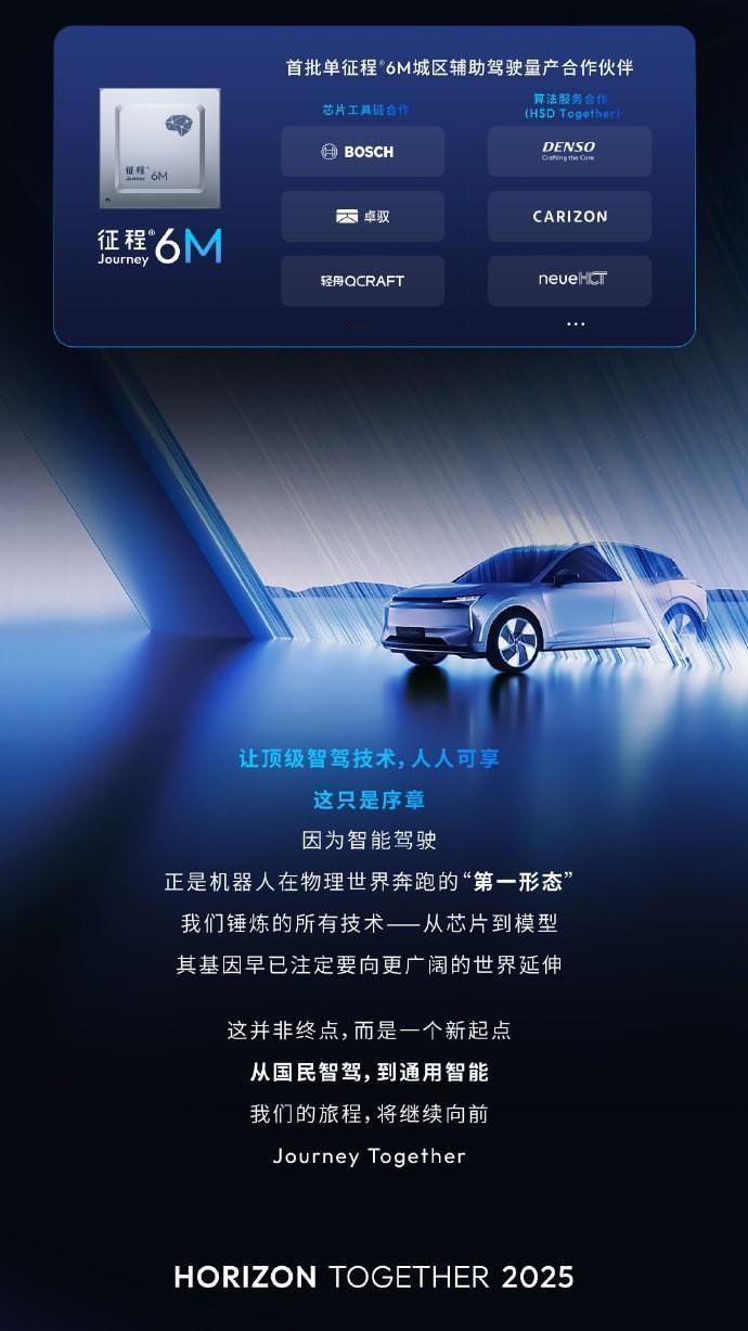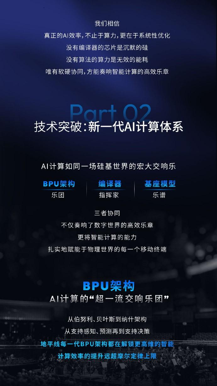 不止于车——智能驾驶作为“机器人的第一形态” 地平线对未来的构想,远不止于智能汽车。在其看来,“智能驾驶,正是机器人在物理世界奔跑的‘第一形态’”。这一极具前瞻性的判断,揭示了其技术布局的深层逻辑。智能汽车本质上是一个高速移动的、需要在复杂物理世界中进行实时感知、决策和控制的智能机器人。在攻克智能驾驶这一极具挑战性的场景中所锤炼出的技术基因,具备强大的可迁移性。 这套核心技术基因,包括了最新一代BPU——「黎曼」架构,AI驱动的编译器,和强大的智驾基础模型算法。例如,为处理车载摄像头、雷达等传感器数据而开发的融合感知技术,同样可以应用于家庭服务机器人、工业巡检无人机等领域;为确保行车安全而构建的决策系统,也可以适配到其他需要与环境进行复杂交互的智能设备中。地平线正在做的,就是将这套在最严苛的汽车规制下打磨成熟的技术体系,持续向更广阔的智能场景延伸。从智能驾驶到通用智能,这套统一的技术基因将成为驱动万物智能化的核心引擎,展现出巨大的应用潜力。