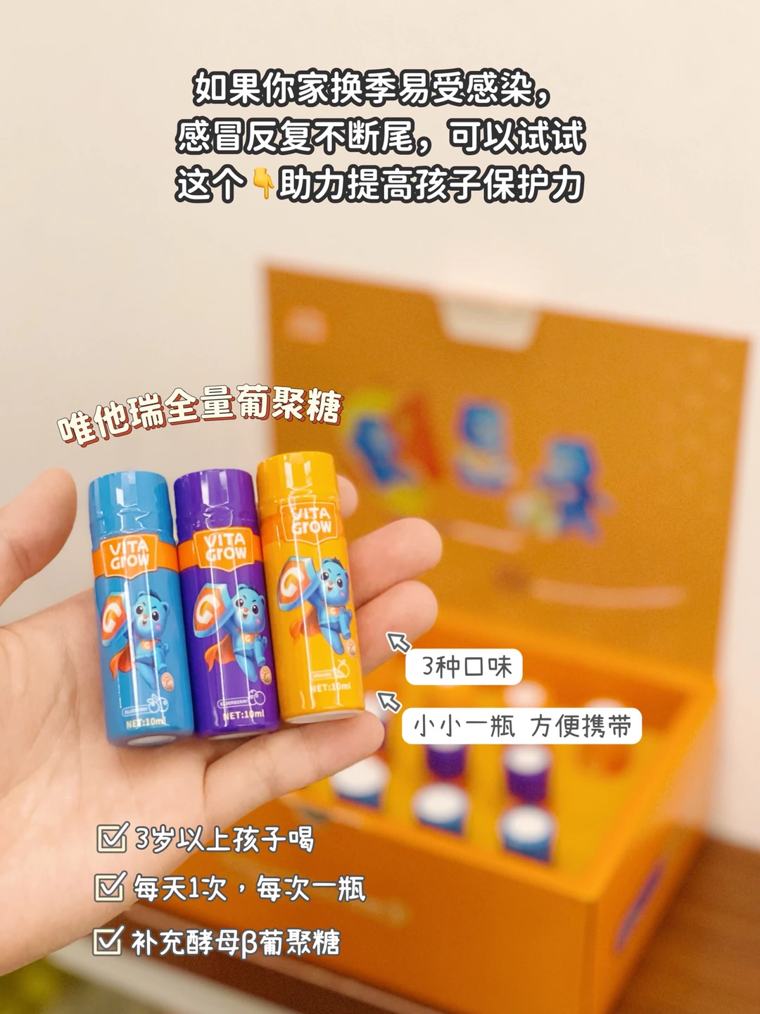 🔹新手妈妈不知道选哪个牌子的葡聚糖的话,可以试试唯他瑞全量葡聚糖,每天小一瓶就行,它里面的成分都是提取自天然酵母益生菌细胞壁,对宝宝来说安全温和,液体好吸收,天然果味,孩子也爱喝 ,我家孩子自从特殊时期之后就一直在喝这个,真的比光吃补品管用多了!宝妈们可以入手试一试!