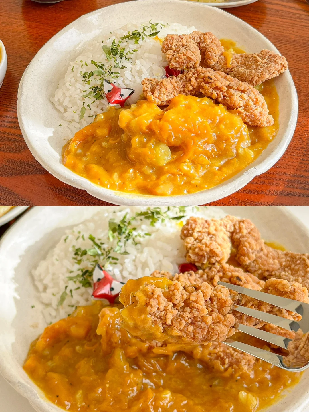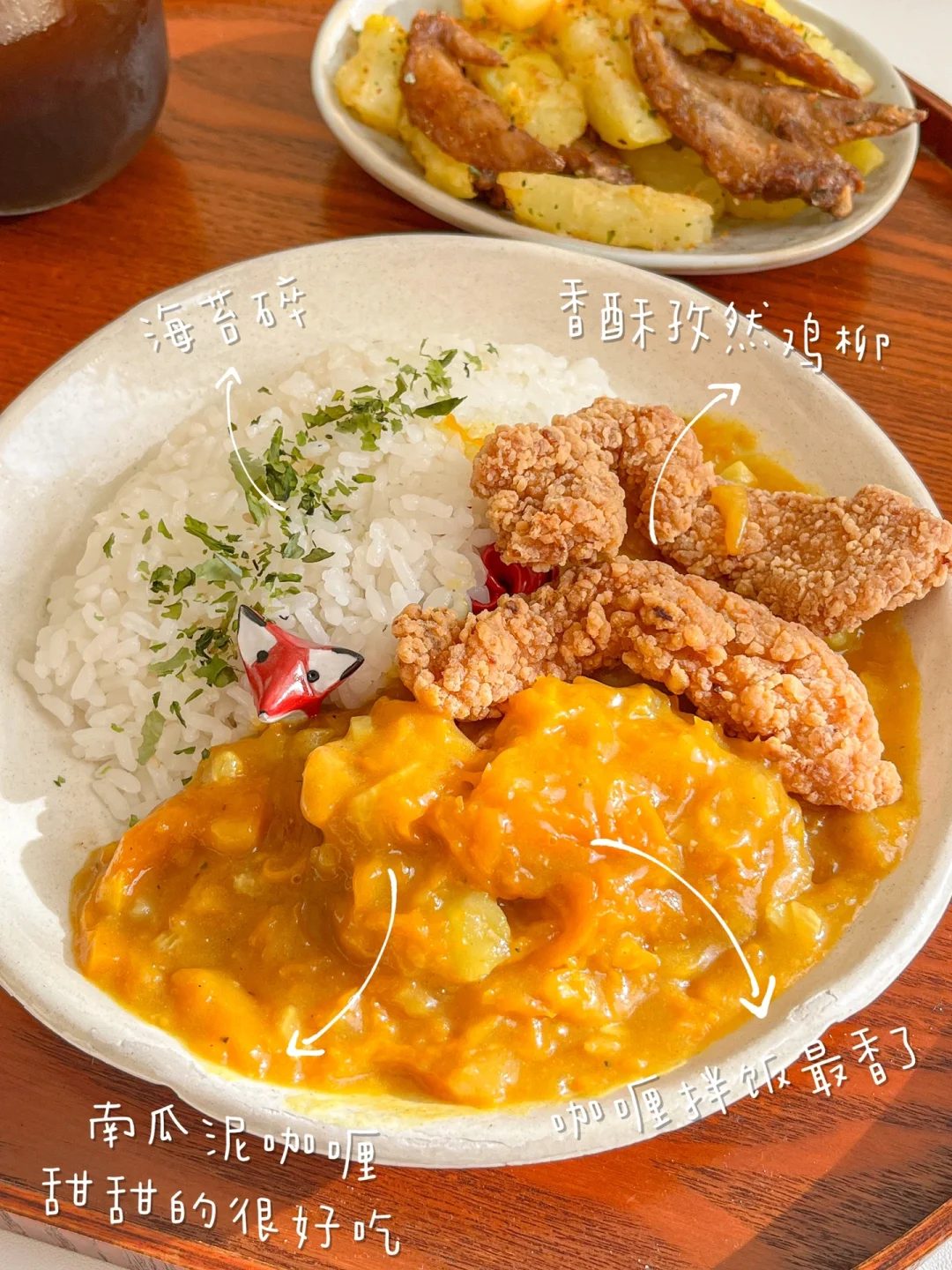 我喜欢煮咖喱的时候放南瓜,带点清甜做出来颜色也很好看。用了日式的咖喱块,洋葱和蒜末炒软加水烧开,放南瓜薄片和咖喱,小火煮5分钟就很入味了!香酥孜然鸡柳沾着咖喱和塔塔酱都好吃😋