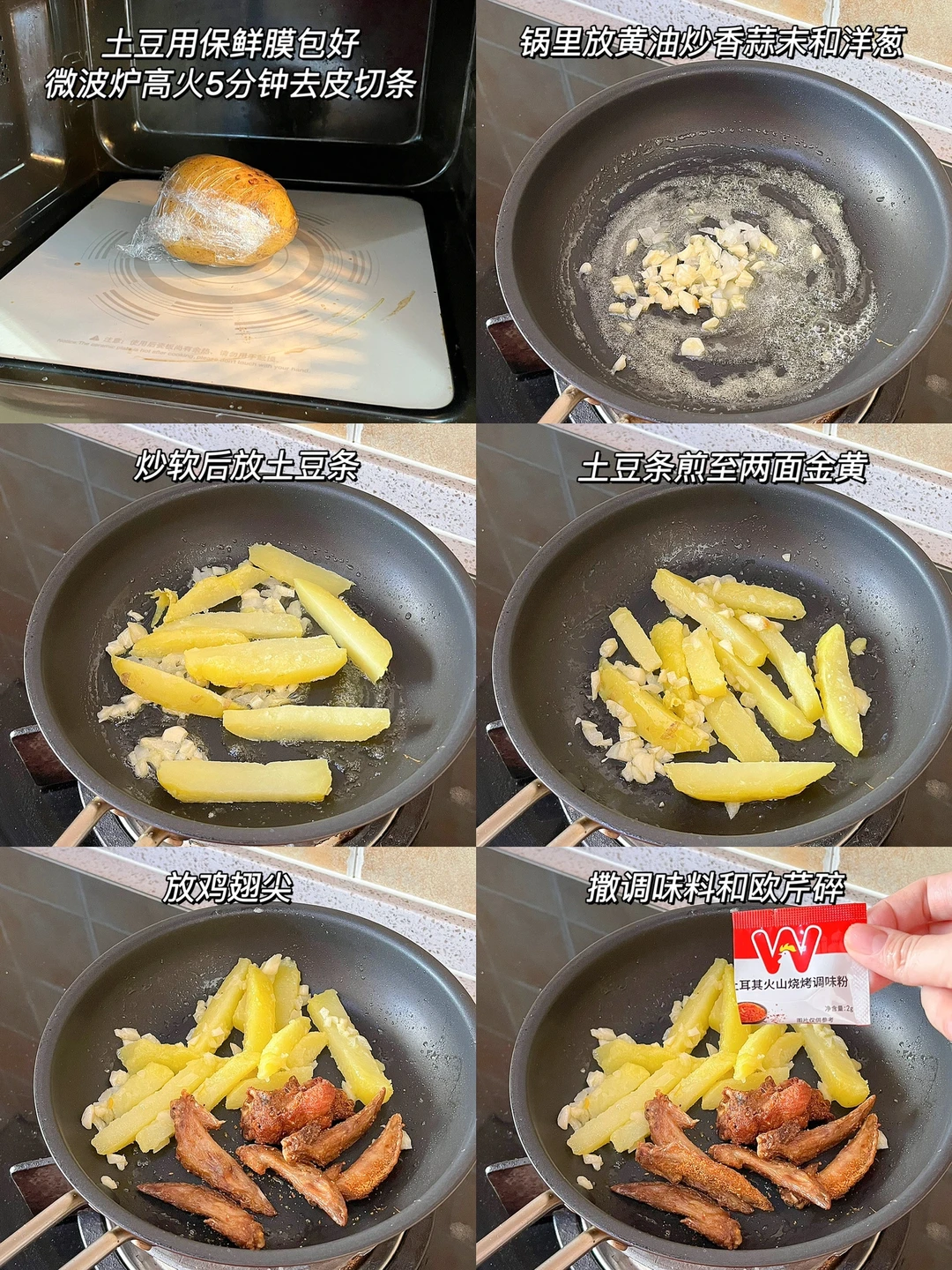 土豆是先用保鲜膜包好,微波炉高火5分钟去皮切条,锅里放黄油炒香蒜末和洋葱碎,炒软后放土豆条,煎2分钟放火山烧烤脆翅尖,撒上烧烤粉和欧芹碎。这么做出来的土豆口感沙沙的,只用了很少的黄油,嘴馋的时候可以试试~