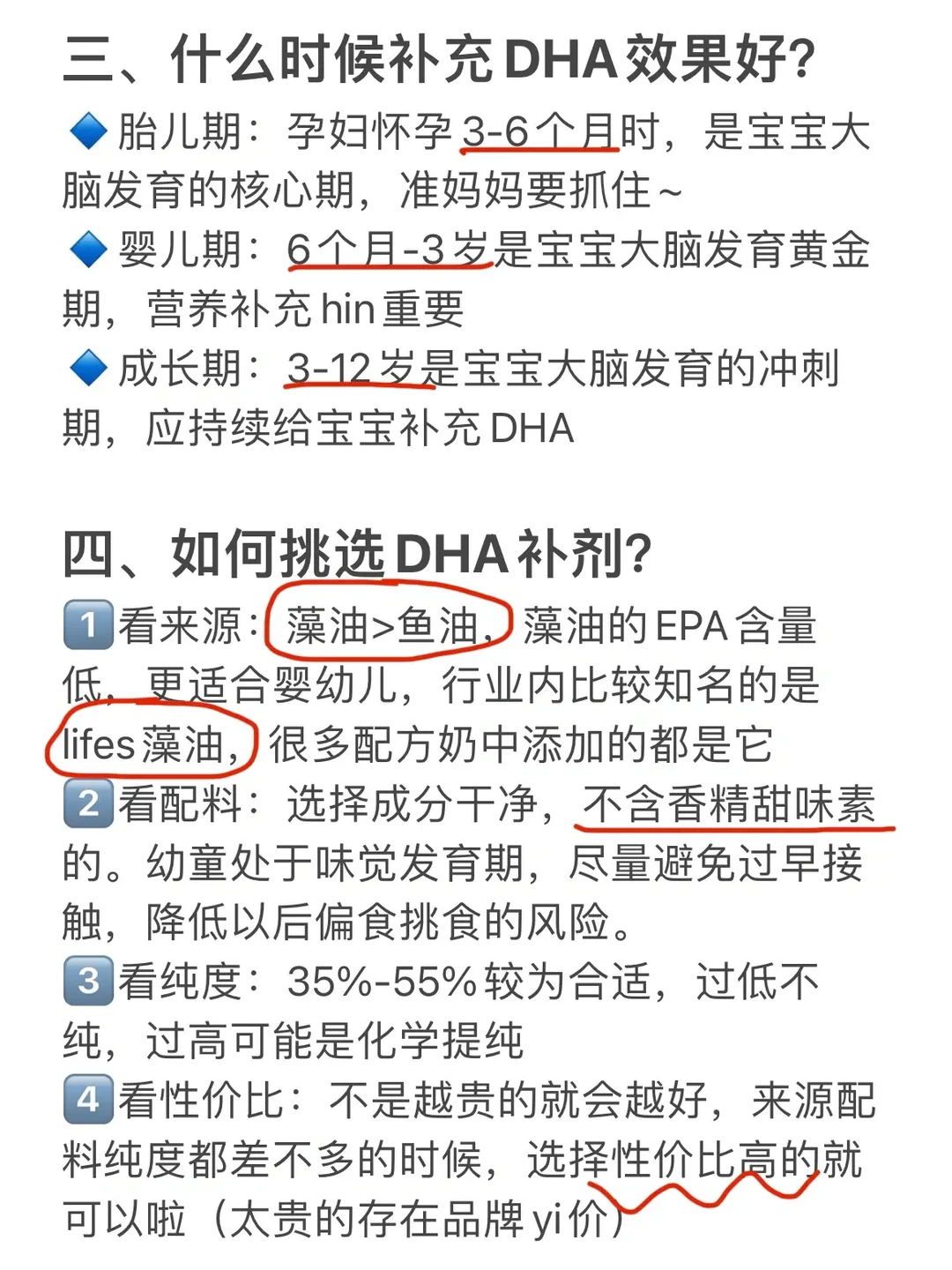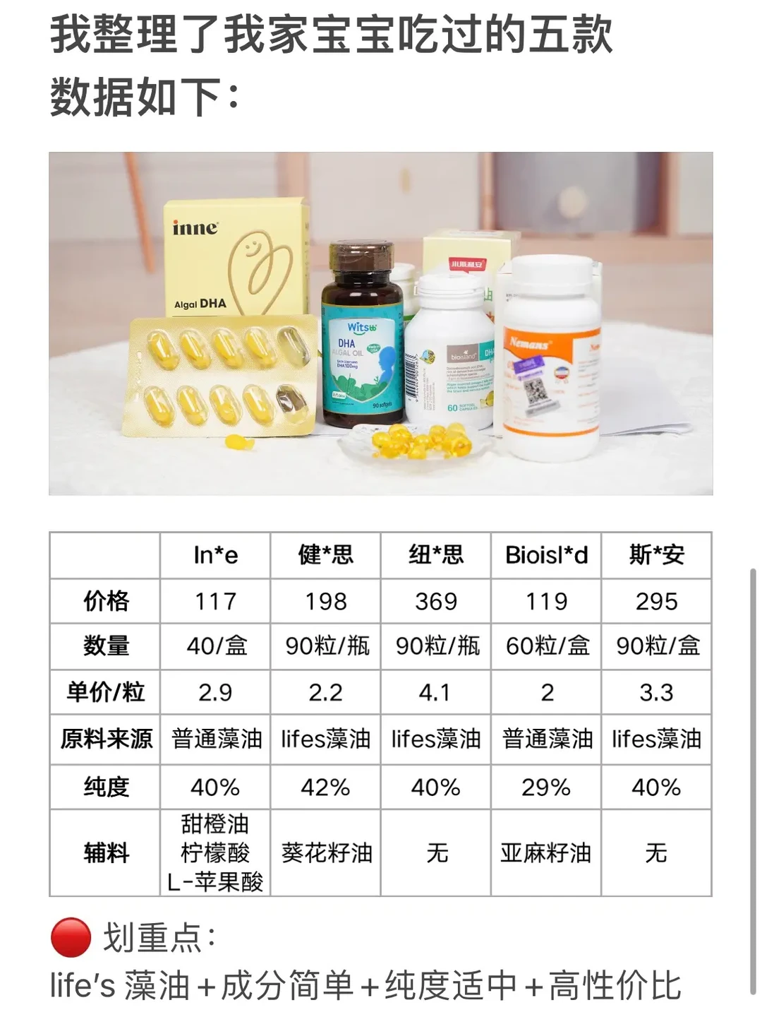 1️⃣看来源:藻油>鱼油 藻油的EPA含量低,更适合婴幼儿。行业内比较知名的是lifes藻油,很多配方奶中添加的都是它
