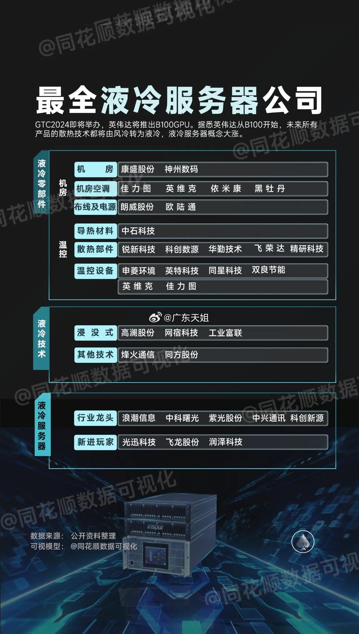 国际液冷产业峰会前瞻,算力热墙下的替代机遇分析!第五届国际AIDC液冷供应链干人峰会暨·国际数据中心液冷市场趋势分析会将于12月18日-19日召开。英伟达GPU从的演进,使传统风冷在机柜功率超30–40kW时彻底失效。而GB200 机柜功耗已达120–140kW,未来VR300机柜更可能突破600kW。液冷凭借导热效率为风冷4–9倍的优势,成为突破“热墙”的唯一选择。瑞银预测,2026年仅英伟达平台液冷需求将达697亿元,国产供应链有望抢占千亿级市场。1.英维克(002837):国内唯一覆盖冷源、CDU、冷板全链条的厂商,冷板式液冷占AI服务器市场份额超40%。其微通道设计使散热效率提升30%,适配英伟达B200/V200芯片。为字节跳动数据中心提供液冷方案,保障GB200服务器稳定性。2.高澜股份(300499):舰船液冷技术转化数据中心场景,浸没式液冷方案PUE低至1.08,获工信部绿色技术认证,与中科曙光合作开发相变液冷模块。3.蓝思科技(300433):收购裴美高公司获北美服务器机柜认证,整合“精密结构件+液冷集成”能力。通过收购切入英伟达供应链,成为机柜结构件二级供应商。4.中石科技(300684):合成石墨基材热管理方案迁移至液冷,子公司中石讯冷团队拥有15年散热经验。3570万元收购中石讯冷51%股权,整合液冷模组研发能力。5.淳中科技(603516):液冷测试平台毛利率74.23%,为英伟达提供AI检测板卡。2024年液冷相关营收中N公司业务占比达60%。6.强瑞技术(301128):其液冷快换接头(UQD)防漏液专利,适配冷板维护场景,供货华为液冷服务器。UQD占液冷成本15%,国产化率不足30%。7.冰轮环境(000811):磁悬浮变频离心冷水机组,服务核电与数据中心。中标“东数西算”宁夏集群项目,核电站冷却技术复用。8.烽火通信(600498):子公司长江计算发布G440K液冷整机柜,背靠央企研发资源。国产化信创项目占比超70%,适配昇腾AI芯片。9.佳力图(603912):风液混动方案降低改造成本,适配中小数据中心,中标的南京国资数据中心项目已交付。10.福蓉科技(603327):AI眼镜铝合金中框散热技术迁移至微型液冷板,用于AR/VR设备。供货夸克AI眼镜,光波导片订单放量。11.飞龙股份(002536):电子水泵技术源自车规级热管理,采用磁阻电机驱动,适配高功率机柜。其模块化设计兼容冷板/浸没式方案,漏液风险低于行业均值30%。获中国台湾电力电子龙头金運科技订单,为国际云服务商GB300集群供应电子水泵,单柜价值量约2.3万元。12.领益智造(002600):液冷结构件通过纳米涂层工艺提升铝合金冷板导热率至200W/m·K,合作华为开发折叠歧管技术,空间占用减少40%。切入Meta自研ASIC服务器供应链,供应冷板及歧管模组。13.思泉新材(301489):纳米石墨烯液冷板导热系数为传统铝材12倍,适配芯片局部热点散热。其微腔注液工艺满足GB300紧凑设计。定增4.66亿投建越南液冷产线,客户含英伟达二级供应商Cooler Master,间接供货字节跳动万卡集群。14.鼎通科技(688668):液冷连接器采用陶瓷密封环,耐压值达1.5MPa(行业1.2MPa)。联合安费诺开发224G高速连接器,集成液冷通道与数据传输。GB300液冷连接器独家供应商,单模组单价200美元(传统方案10倍),单机柜用量252对。连接器占液冷成本18%,公司市占率超60%,2026年净利或达5亿。15.川环科技(300547):UQD快接头通过UL认证,插拔寿命超10万次(国标5万次)。歧管采用3D打印,重量减轻50%。供应字节跳动GB200集群快接头,GB300用量从126对增至252对,单柜价值量占比15%–20%。16.飞荣达(300602):液冷结构件采用超塑性铝材冲压,歧管多分支设计支持10路并联,压降降低20%。Meta ASIC服务器液冷结构件主供,华为昇腾生态方案通过认证。17.海兰信(300065):海底数据中心(UDC)专利商,将舰船液冷技术迁移至海底舱体,PUE低至1.08,单舱功耗6MW。18.超频三(300647):相变液冷模组热流密度突破1000W/cm²,采用微针阵列增强沸腾换热,适配GPU局部热点。19.松芝股份(002454):大巴空调液冷技术转化,开发机柜级冷源系统,COP能效比达6.0(行业4.5),供货腾讯怀来数据中心。20.统一股份(600506):开发的浸没式液冷油液和冷板式冷却液,通过AI配方仿真模型实现20年更换周期,远超行业3–5年标准。