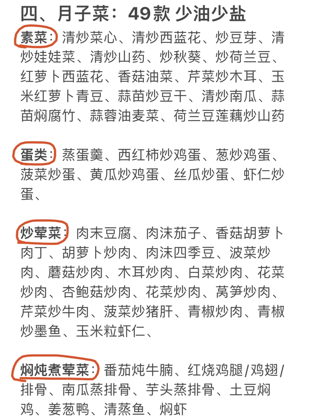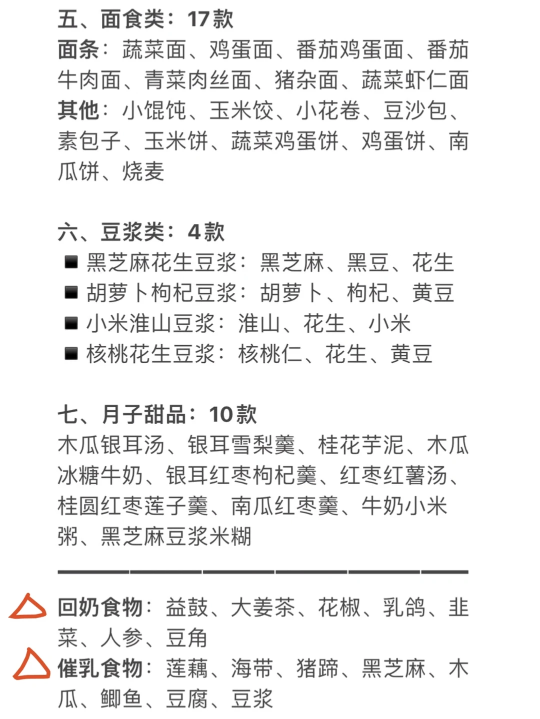 . ⭕️饮食思路 产后第1周,排恶露,宜清淡忌补太过; 产后第,2周,下奶期,营养跟上忌油腻; 产后第,3周,恢复期,肉类蔬菜要跟上; 产后第,4周,滋补期,鲫鱼海参公鸡汤; 产后第,5周,调理期,饮食多样要均衡; 产后第,6周,掉秤荤素搭配,营养均衡 . ⚠️注意事项 ①多吃易消化的流质食物,如:小米粥、鲫鱼汤 ②多吃新鲜的蔬菜水果 ③多吃含铁、钙、高蛋白的食物 ④不吃辛辣刺激性食物 ⑥不要碰烟酒类 . 我会持续更新孕育干货 关注我,新手妈妈带娃不迷路