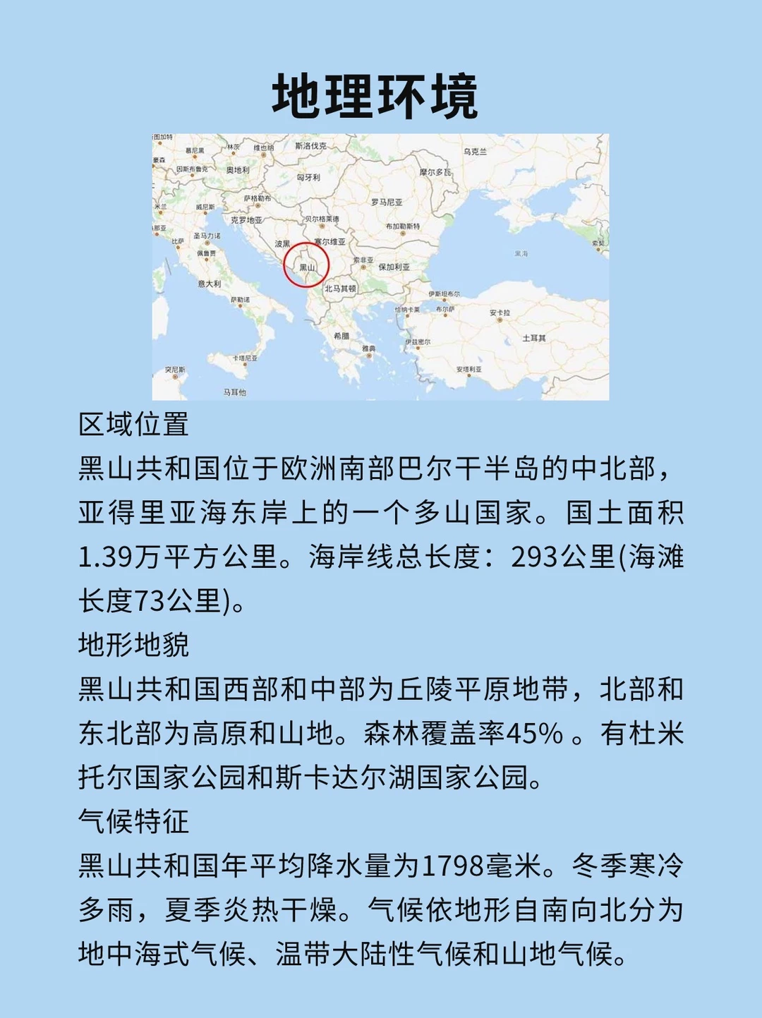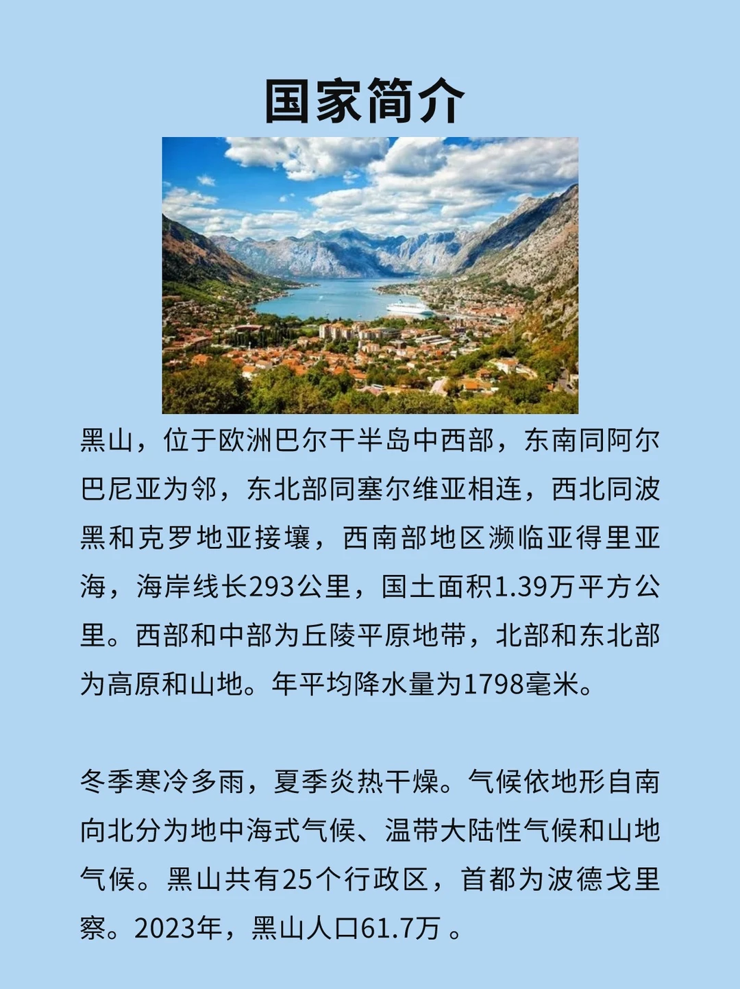 [打卡R]黑山,位于欧洲巴尔干半岛中西部,东南同阿尔巴尼亚为邻,东北部同塞尔维亚相连,西北同波黑和克罗地亚接壤,西南部地区濒临亚得里亚海,海岸线长293公里,国土面积1.39万平方公里。 [气球R]西部和中部为丘陵平原地带,北部和东北部为高原和山地。年平均降水量为1798毫米。冬季寒冷多雨,夏季炎热干燥。气候依地形自南向北分为地中海式气候、温带大陆性气候和山地气候。 [种草R]黑山共有25个行政区,首都为波德戈里察。2023年,黑山人口61.7万。