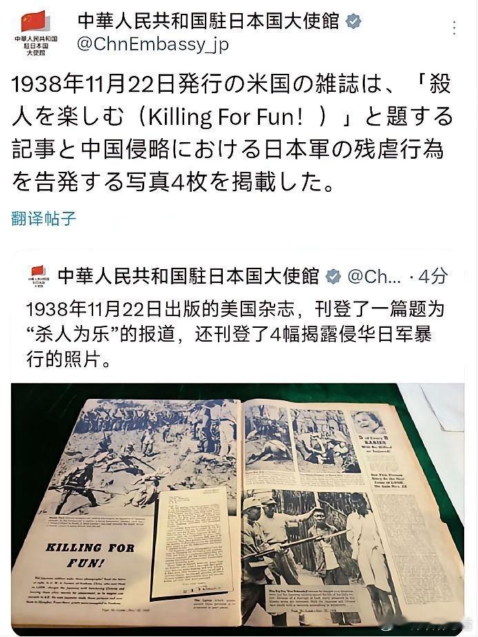 中国驻日使馆重磅发文:以史料铁证揭露日军暴行 筑牢二战秩序安全阀12月16日,中国驻日本大使馆发布重磅内容,援引1938年11月22日美国杂志题为“杀人为乐”的报道及4幅珍贵照片,以不容辩驳的史料铁证,揭露侵华日军的战争暴行,直指日本右翼势力妄图挣脱二战秩序束缚的危险行径。二战结束以来,“二战秩序”与《波茨坦公告》的相关约束,始终是规范日本战后走向、守护亚太地区和平稳定的关键防线。如今日本在既有枷锁约束之下,仍对中国台湾地区抱有觊觎之心,其篡改历史、参拜靖国神社的行为,更是与口口声声强调的“二战秩序”“无核原则”形成鲜明反差,暴露出强烈的历史报复心态。倘若放任日本脱离二战后形成的国际秩序约束,其一旦走上研制核武器的危险道路,不仅会让亚太地区数十年的和平成果付诸东流,更将成为威胁世界安全的巨大隐患。此次中国驻日使馆发文,既是以史实正视听,更是向世界各国敲响警钟:二战秩序的约束从不是困住日本的枷锁,而是守护亚太和平的安全阀,任何试图挣脱束缚的行径,都将遭到爱好和平国家与人民的坚决反对。【注:本文观点基于公开信息整理,仅供参考】