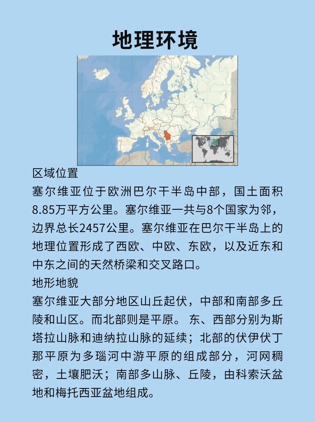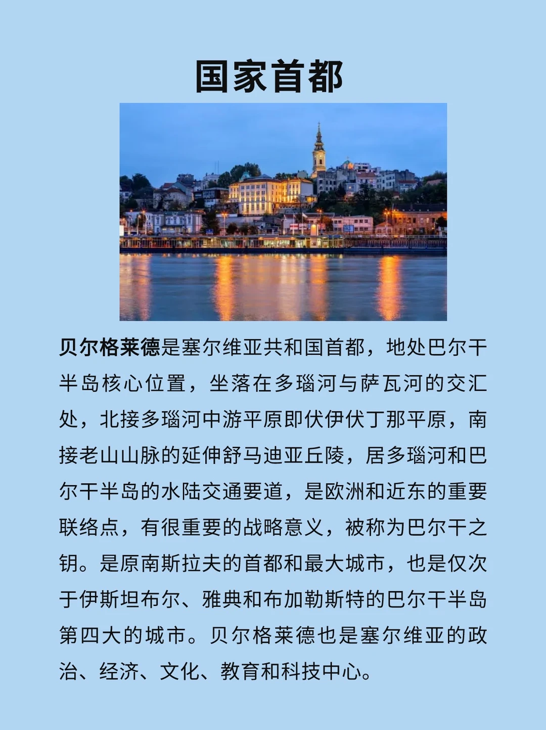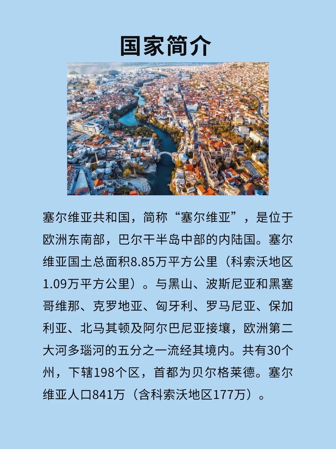 [打卡R]塞尔维亚共和国,简称“塞尔维亚”,是位于欧洲东南部,巴尔干半岛中部的内陆国。塞尔维亚国土总面积8.85万平方公里(科索沃地区1.09万平方公里)。 [种草R]与黑山、波斯尼亚和黑塞哥维那、克罗地亚、匈牙利、罗马尼亚、保加利亚、北马其顿及阿尔巴尼亚接壤,欧洲第二大河多瑙河的五分之一流经其境内。 [气球R]共有30个州,下辖198个区,首都为贝尔格莱德。塞尔维亚人口841万(含科索沃地区177万)。
