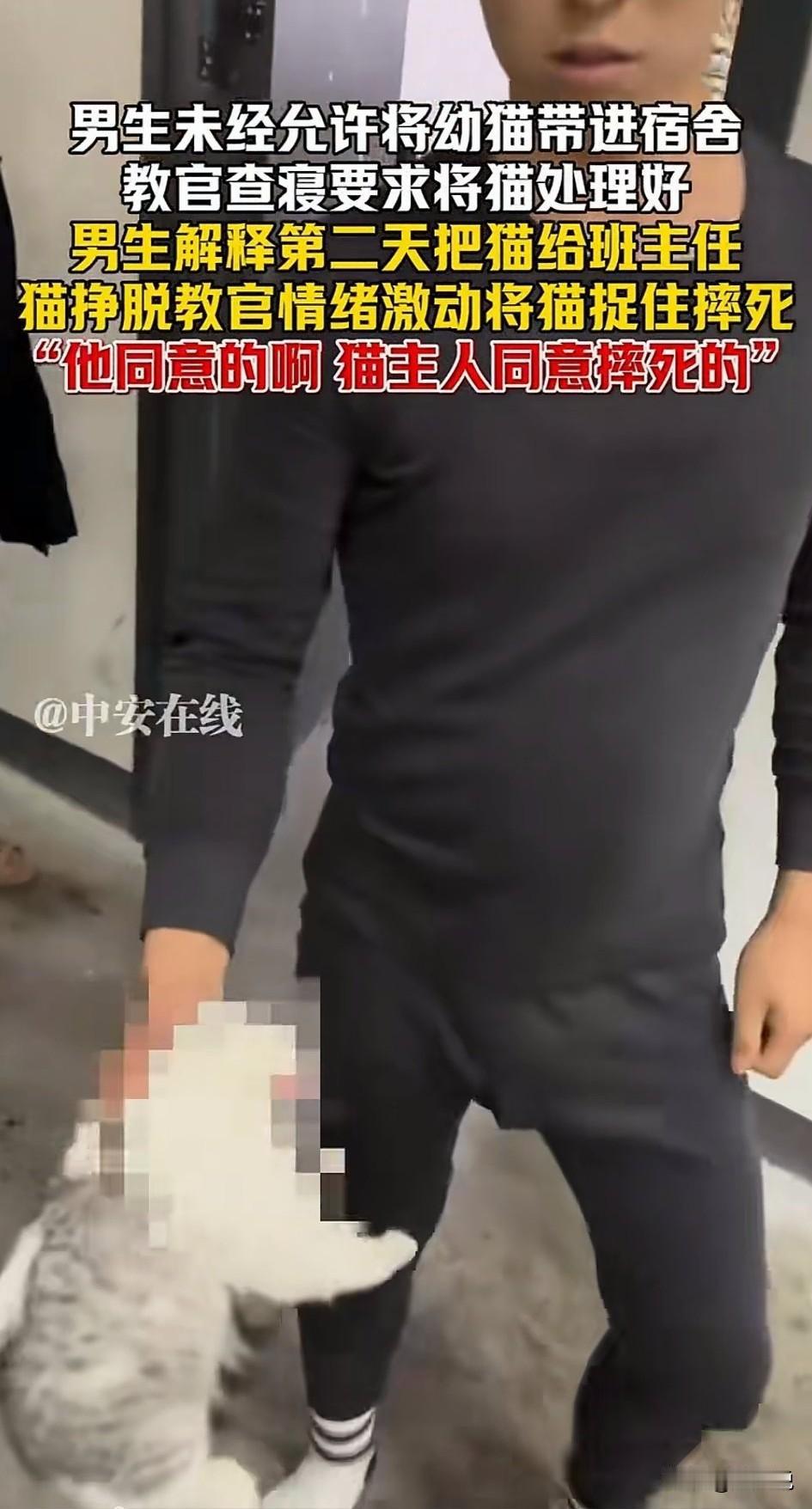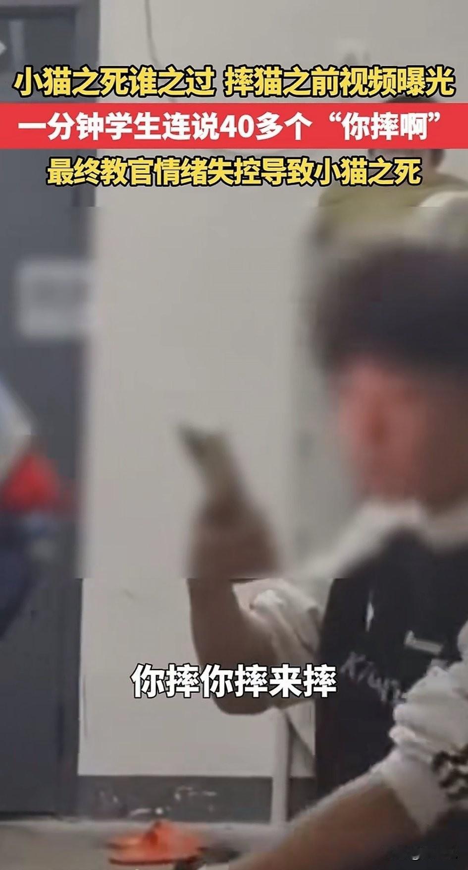 小猫被摔死,谁是凶手? 看了完整视频后,我觉得双方都没有把小猫当回事。 猫主人从来没考虑小猫的结局,只为了自己出口去,宁愿不要小猫,也要刺激教官,让教官犯错,用小猫的生命惩罚教官。 教官也没有考虑小猫是一条生命,被猫主人刺激,直接伤害了小猫。 教官有一点做的好,被激怒了也知道,要脱下了身上的衣服,不把伤害行为上升到身份高度,以普通人身份出气。 最无辜的是小猫,成了双方的出气道具,