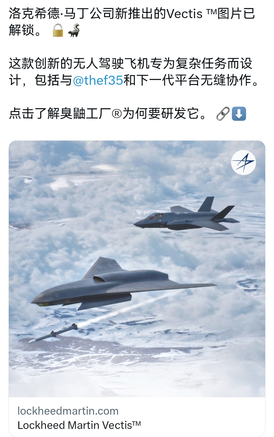 🔻LM官号不停发Vectis无人僚机的PPT图片。🔻之前九三阅兵后,故作神秘说臭鼬工厂即将“大的要来了”,结果就公布了个PPT图片,说有个无人僚机计划,原型机正在制造中预计明年首飞。🔻臭鼬工厂啥时候沦落到这种街头吆喝,还是猛画AI生成CG图像的地步了?🔻臭鼬工厂没有活可以咬打火机,还是看看老中南北的臭獭工厂吧家人们。
