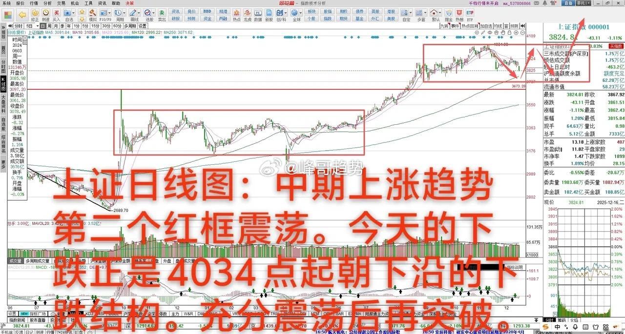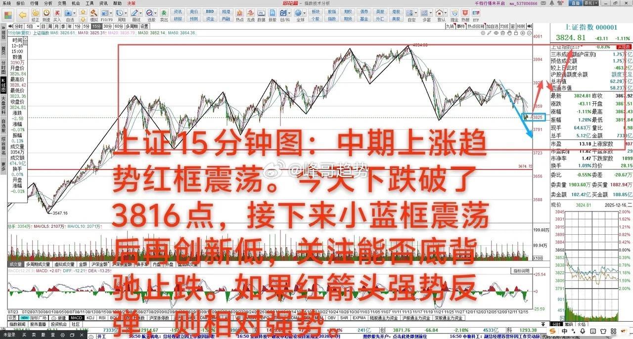 大A:中期结构还在,短期走弱 12月16日 大A下跌1.11%,中期上涨趋势宽幅震荡。短期3936点小级别下跌结构,昨天反弹上不去,有走弱迹象,今天开盘直接下探考验3816点,小创3815点新低。从3936点起至今天小级别下跌并不背驰,接下来围绕3816点小震荡,充分震荡后再创新低概率大。形成4034点日线下跌结构的3815-3936点震荡,关注这个下跌结构的止跌,大概率能再3732点上方止跌,整体继续在3732-4034点宽幅震荡。 沪深300下跌1.2%,中期上涨趋势宽幅震荡。今天直接下跌再创新低,4640点小级别下跌结构,目前并不背驰,走得比较弱,接下来小震荡后再创新低,应该不会直接跌穿4421点。 科创50下跌1.94%,中期上涨趋势宽幅震荡。今天的下跌逼近1273低点,走得不强,整体是1210-1588点宽幅震荡。短期1360点小级别下跌结构,目前不背驰,接下来应该走1273-1300点小震荡,充分震荡后再创新低概率大,应该不会跌穿1210点,能迎来底背弛低点。 创业板下跌2.1%,中期上涨趋势2892-3331点区间震荡。今天开盘直接跌穿3137-3246点震荡,尾盘小反拉3096高点,反抽告别3137点,形成3246点小级别下跌结构,明天小下探后反弹,走成小震荡,充分震荡后再创新低,大概率能在2892点上方形成底背弛低点,迎来反弹。 今天领涨的题材概念:零售、免税店、网约车、教育、食品加工制造、预制菜、多元金融、乳业、旅游及酒店、饮料制造、移动支付、ETC、中船系、美容护理、汽车整车、机场航运、无人零售等。领涨的还是大消费,其他方向均不同程度的调整,跌多涨少的市场。近期来只要算力为首的大科技比较容易带动上证指数上涨,今天的下跌各个算力细分板块都回到下方震荡,短期内难持续上涨。另外商业航天今天也调整下来,没有破进下方震荡,但已有小顶背驰了,需要充分震荡才能上涨。中期跟踪情况:1、证券下跌0.62%,中期上涨趋势宽幅震荡。今天震荡下跌,没上冲,也没创新低,继续1670点小级别下跌趋势的1602-1634点弱势震荡,已经朝低点收窄震荡,再创新低概率大,关注能否出底背弛,迎来反弹。2、元件下跌1.19%,中期上涨趋势13269-15768点区间震荡。短期15527点小级别下跌结构,今天震荡下跌已经靠近前面低点,明天小下探后有反弹,反弹能站上15010点,相对强势,随时冲击15527点。如果反弹上不去,则会走成弱势14282-14851点震荡,充分震荡后,再创新低概率大。3、低空经济下跌1.32%,中期上涨趋势1994-2210点区间震荡。今天再创小新低,形成2152点小级别下跌结构,明天小下探后反弹,走成2061-2097点弱势震荡,再创新低概率大。4、消费电子下跌1.77%,中期上涨趋势10485-12087点区间震荡。今天震荡下跌,破了11040-11653点震荡,尾盘反抽告别,形成11653点小级别下跌结构,明天小下探后反弹,如果强势,则要站上11320点,随时有冲击11653点可能。冲不上去,则会走成10855-11083点弱势震荡,再创新低概率大。5、半导体下跌1.83%,中期上涨趋势宽幅震荡。短期10679点小级别上涨趋势的11239-11964点震荡结构,今天震荡下跌,破了11553-11964点震荡,放宽的11239-11964点震荡。明天震荡小下探后会反弹,能过11580点,有冲击11964点可能。如果反弹上不去,走成11239-11580点小震荡,走得更弱,增大跌穿下去的可能。6、军工装备下跌2.33%,中期上涨趋势宽幅震荡。今天直接下探,直接跌穿2356-2435点震荡,尾盘反拉,收盘2354点没回到震荡,明天发力上冲,则有冲击2435点可能。明天直接下探,则会走成2321-2369点弱势震荡,再创新低概率大。短期跟踪情况:A、这2天大消费中的零售走得挺强,今天小创新高,短期关注能否突破并回踩确认住,一旦确认住,短期有加速可能。B、另外短期关注6G概念、卫星导航、光纤概念、打飞机、F5G概念、可控核聚变,这些板块今天的调整还保持在突破震荡上方后的小震荡,一旦市场反弹,随时有加速可能。A股指数A股回升大a指数A股缩量493亿