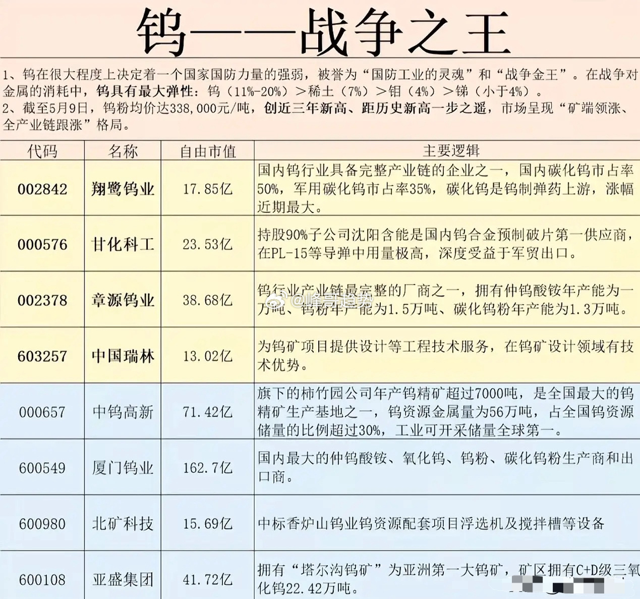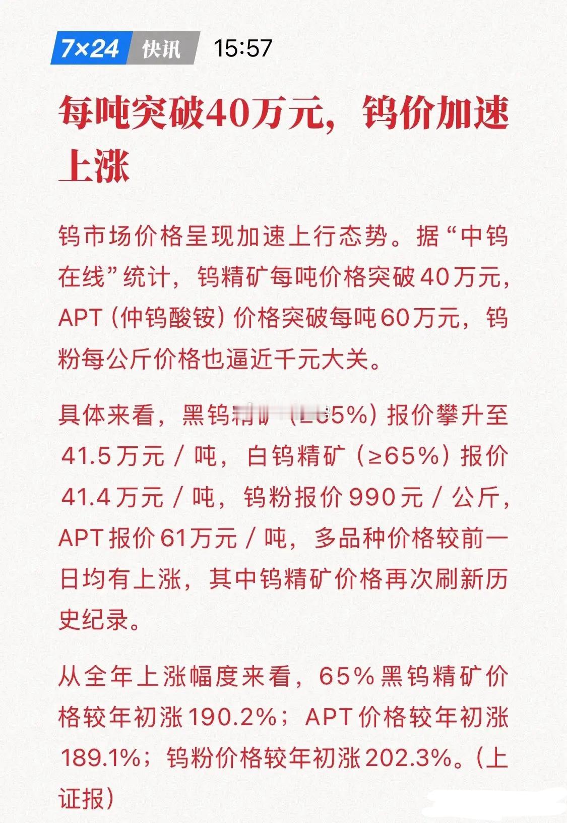 涨不停!不停涨!已破40万/吨,“战争金王”再上风口浪尖!你可能没听过仲钨酸铵,但市场已经炸了!最新数据显示,钨精矿价格突破40万元/吨,APT(仲钨酸铵)飙升至60万元/吨以上——双双刷新多年新高,且涨势还在加速!这不是普通涨价,而是一场由“硬核需求+稀缺供给”引爆的战略资源行情。钨,被称为“工业牙齿”,广泛应用于高端刀具、航空航天、新能源汽车、军工装备等关键领域。随着中国制造业向高精尖升级,对高性能钨材的需求激增;而国内矿山受环保限产、资源品位下降影响,供应持续收紧——供需缺口正在拉大。当前,钨已被列入我国《战略性矿产名录》,出口受限、战略地位凸显。国际市场上,欧美也在加速囤货,全球抢钨战悄然打响。钨,正从幕后走向台前,成为高端制造与国家安全双重逻辑下的硬通货。a股今日看盘360称财务造假等言论失实