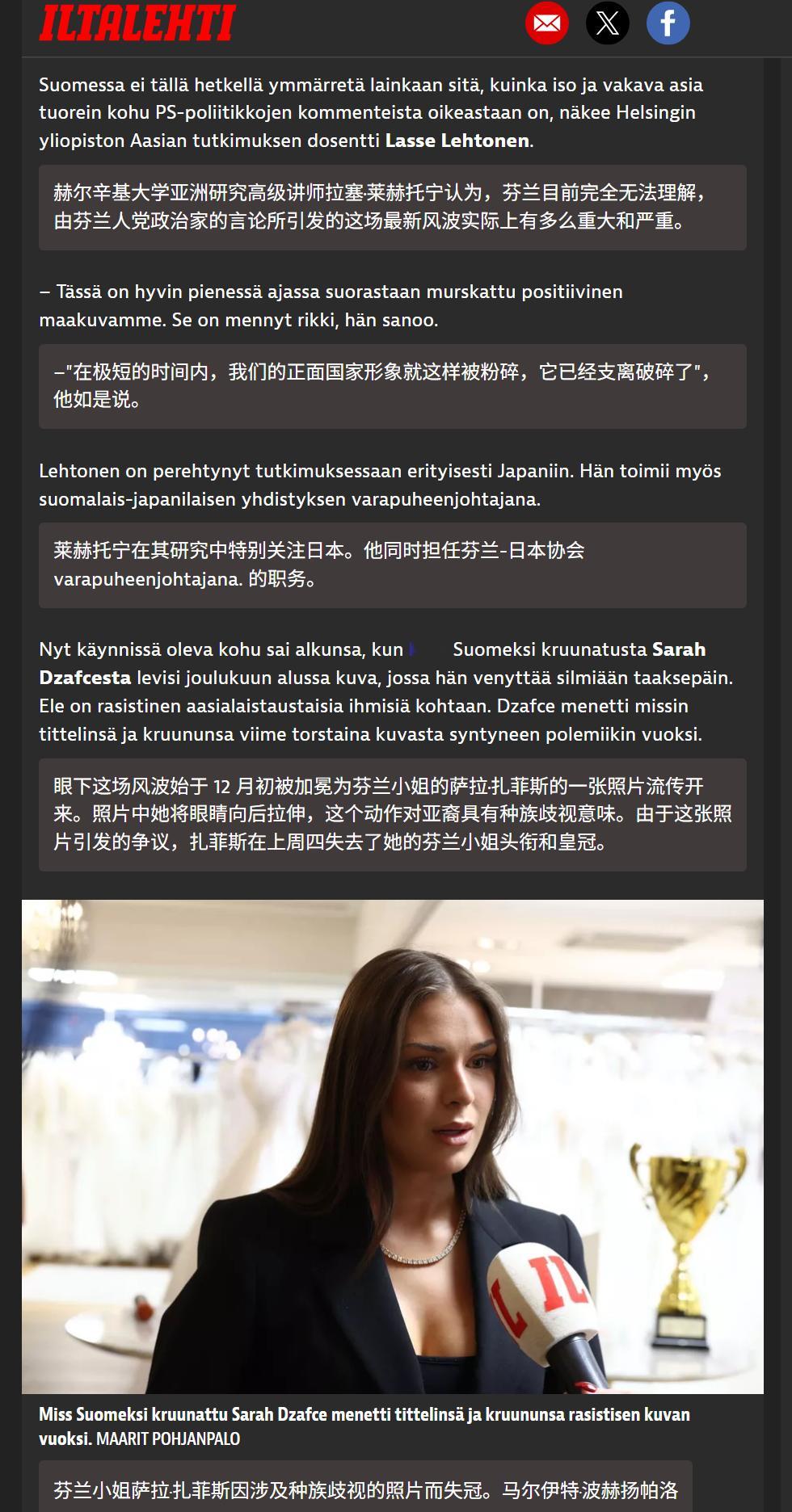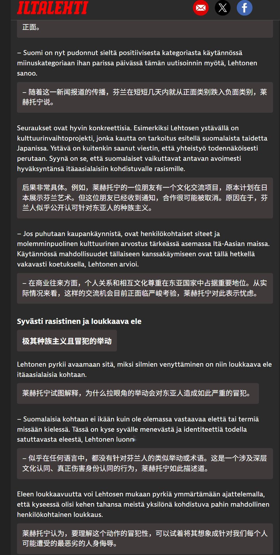 🔻韩国《朝鲜日报》讨论芬兰人拉眼角歧视亚洲人事件,韩国人的文章提及芬兰所谓的"Fingolia"历史——该词由 Finland(芬兰)与 Mongolia(蒙古)组合而成。🔻韩国媒体报道称,19 至 20 世纪的西欧种族理论家曾根据高颧骨等体貌特征,将芬兰人标记为"欧洲居住的蒙古人",并视其为白人社会中的次等族群,"曾经被西欧人歧视的芬兰人,如今却在嘲弄亚洲人。芬兰议员们的眯眯眼画像,难道是为了祭奠其蒙古先祖的仪式吗?"🔻赫尔辛基大学亚洲研究高级讲师拉塞·莱赫托宁认为,芬兰目前完全无法理解,由芬兰人党政治家的言论所引发的这场最新风波实际上有多么重大和严重。🔻"在极短的时间内,我们的正面国家形象就这样被粉碎,它已经支离破碎了",他如是说。涉嫌歧视中国人芬兰小姐公开道歉海外新鲜事热点现场