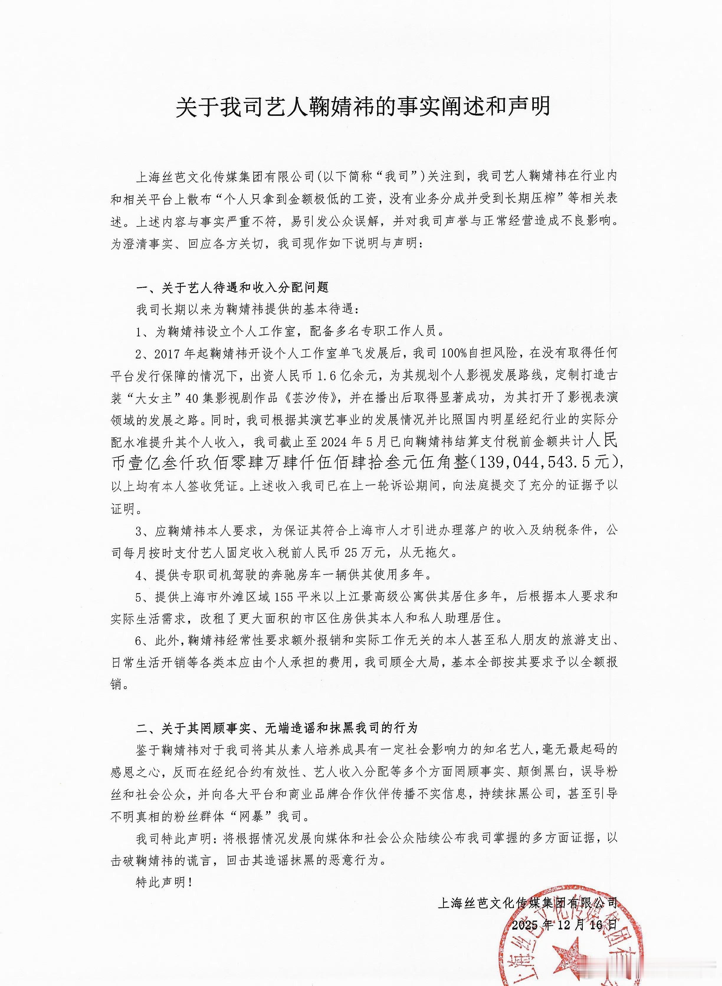 丝芭称已支付鞠婧祎超1.39亿 丝芭晒出来这份鞠婧祎收入:固定工资月薪25w+专职司机+江景大公寓+旅游、日常开销支出报销,10年合计收入1.39亿