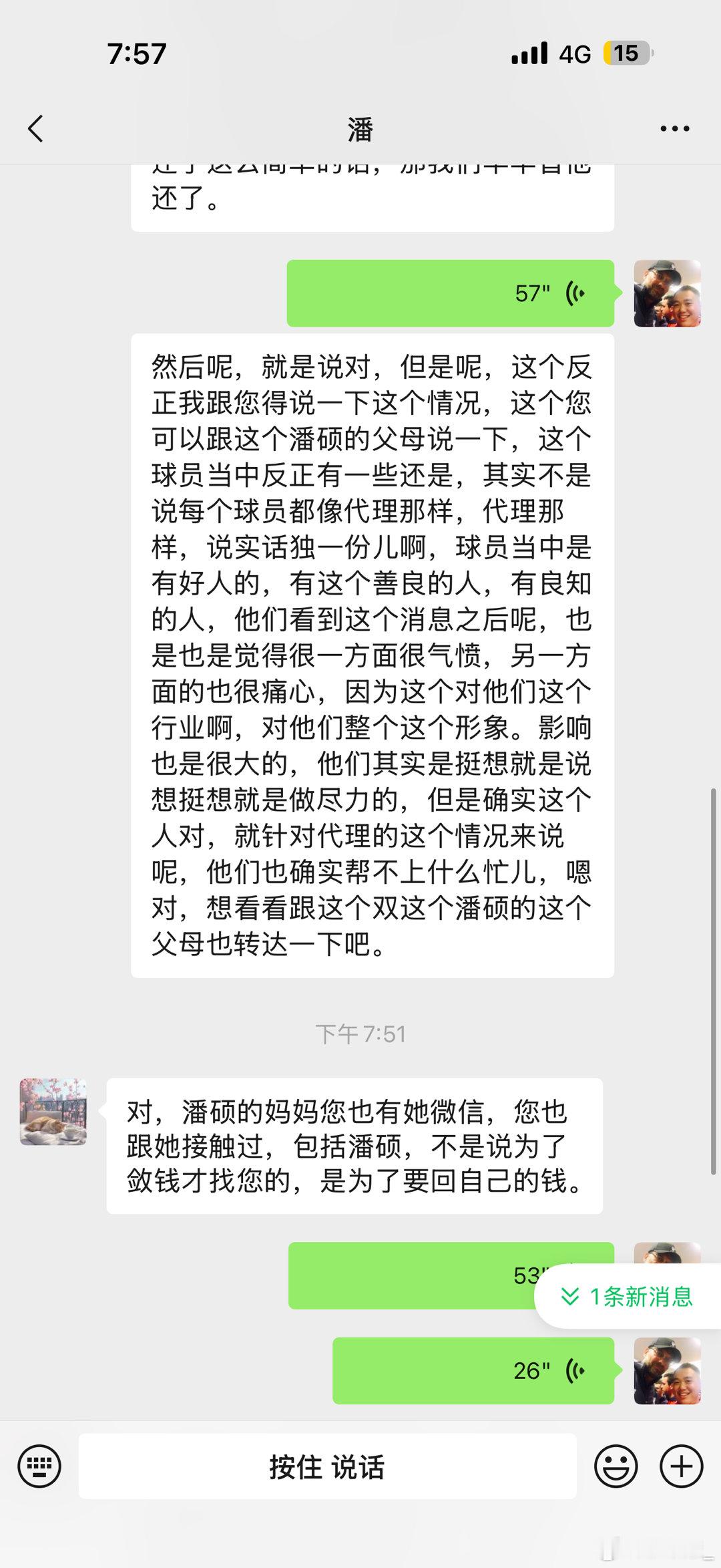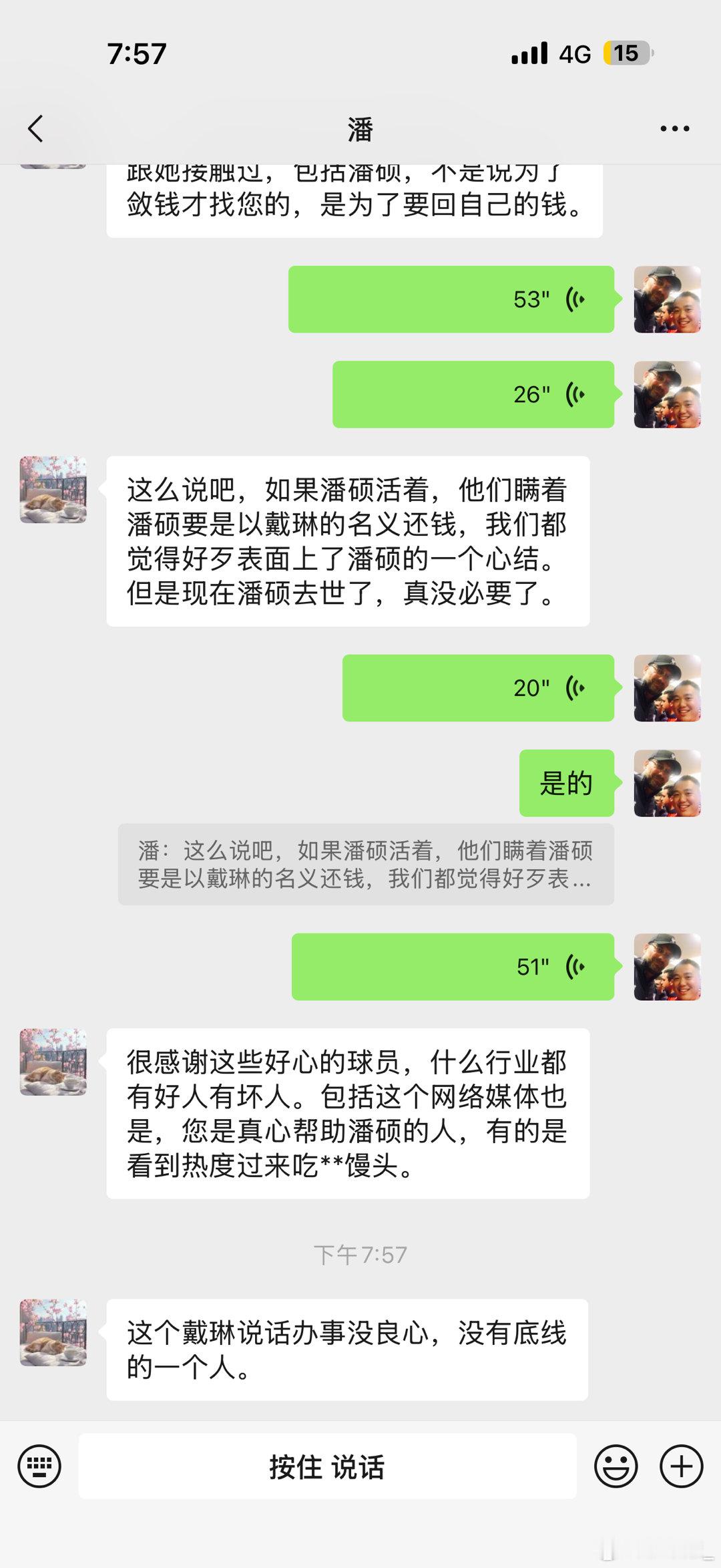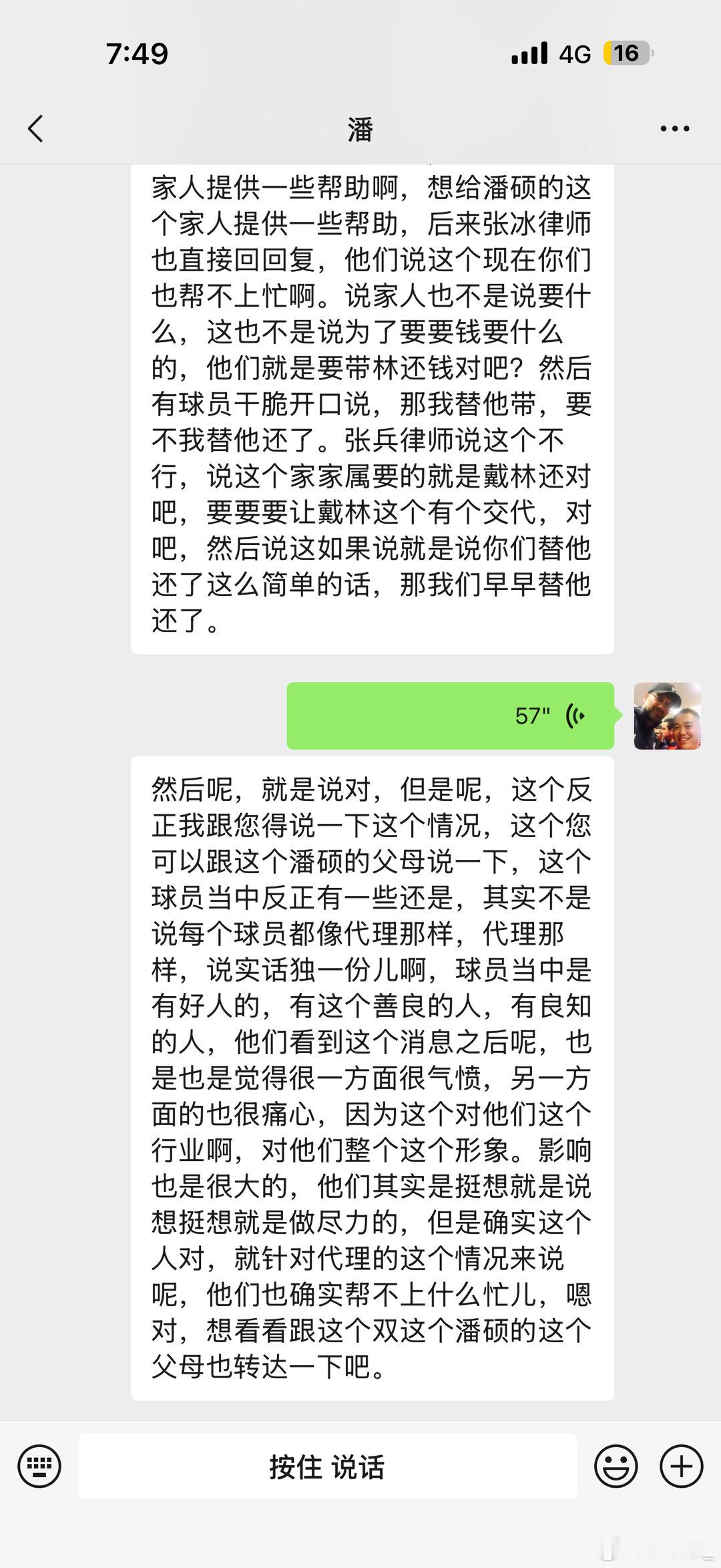 昨天晚上潘硕去世的消息传出后,有几个球员联系到张冰律师和我,这其中基本都是张律的代理客户,有著名国脚也有自己还被欠薪的小孩。他们询问潘硕家人目前的需要,希望能够匿名为潘硕家人提供经济上的帮助,我们也解释了由于潘硕已经离世,潘家人并不想要捐款,只想要戴琳还钱,在这点上他们确实帮不上忙。还有球员说戴琳差多少钱他来还,这个张律也解释了,冤有头债有主,人家需要的是戴琳还,如果谁还都行我们早就补上了!在这里讲出这个事一方面是想说潘家并没有想借舆论来争取利益的想法,他们只想讨个公道给潘硕一个交代。另一方面就是这件事本身给中国的球员群体带来了巨大的负面影响,各个社媒充斥着针对整个球员群体的批判。但事实上每个领域都有好人坏人,中国足球圈也存在很多的正能量!