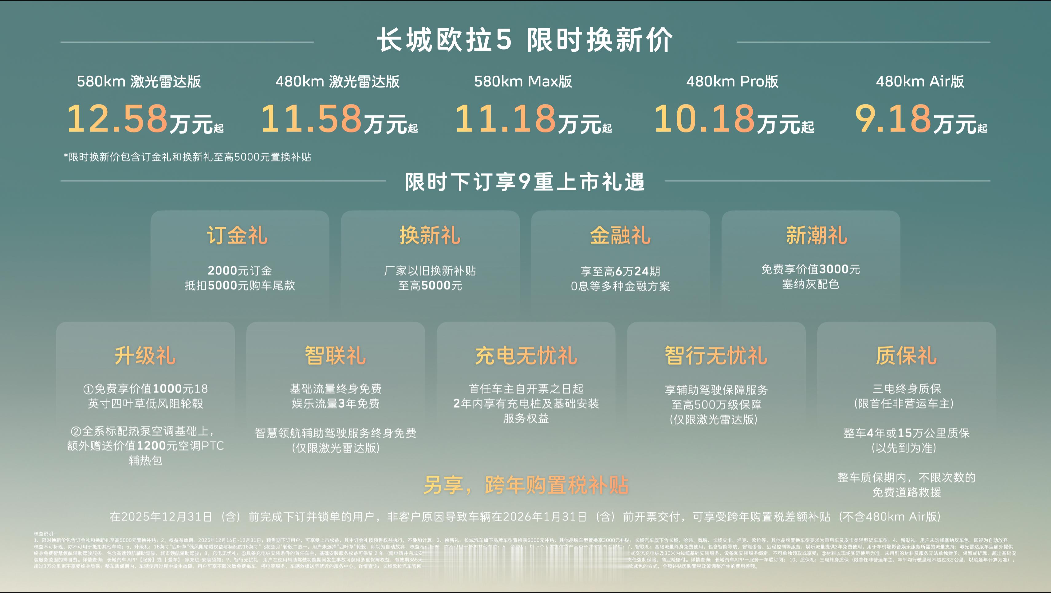 长城欧拉5(全新平台首款量产车)正式上市,定位A级纯电SUV,限时换新价9.18万起,享9重上市好礼及跨年购置税补贴。车型亮点:自然美学设计、Coffee Pilot Ultra辅助驾驶、双大模型智能系统、五星健康座舱及宝马调校底盘,低拥车成本、可靠品质,年轻人“严选搭子”,已进入全球50余国,服务60万用户。