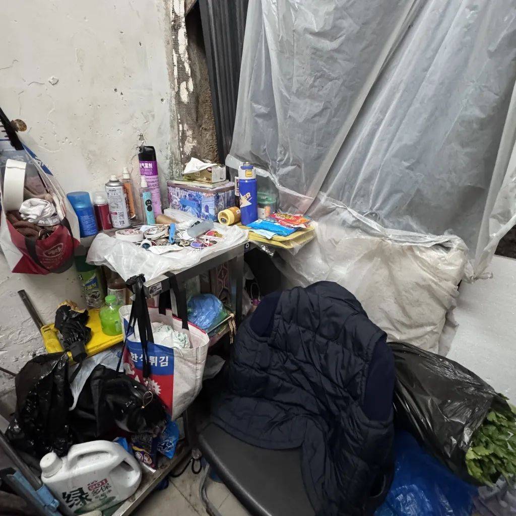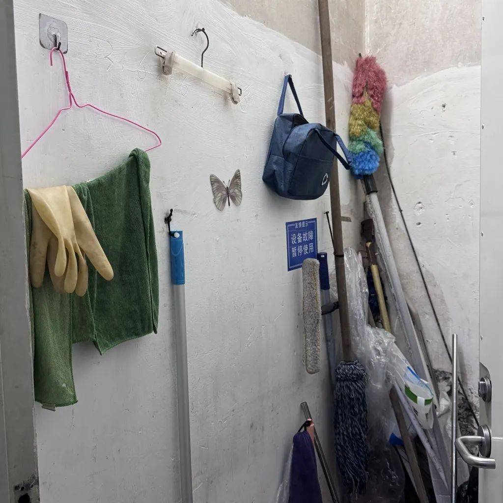 走进上海某三甲医院负一层的工具间,59岁的肖兰正蹲在地上吃午饭。两平米的空间里,消毒水味混着饭香,墙上挂着用废泡沫板自制的置物架,一只捡来的塑料蝴蝶装饰在裂缝处。“别看这儿小,关上门就是我的‘VIP休息室’。”她笑着指给记者看,双层保洁车上塞着饭盒、水杯,甚至还有同事送的青菜——这是她在人潮汹涌的地铁站里,唯一能喘口气的地方。