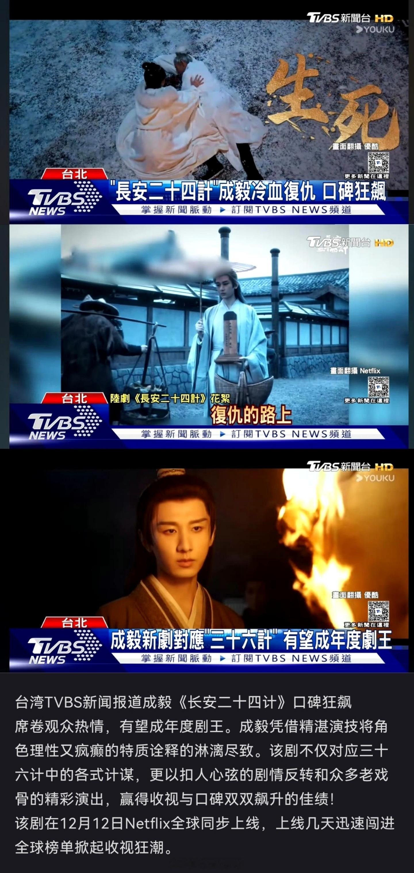 台湾TVBS新闻报道成毅长安二十四计口碑狂飙,席卷观众热情,有望成年度剧王。Netflix上线几天迅速闯进全球榜单掀起收视狂潮!这部剧真的太火了成毅 求求你们再看一会吧