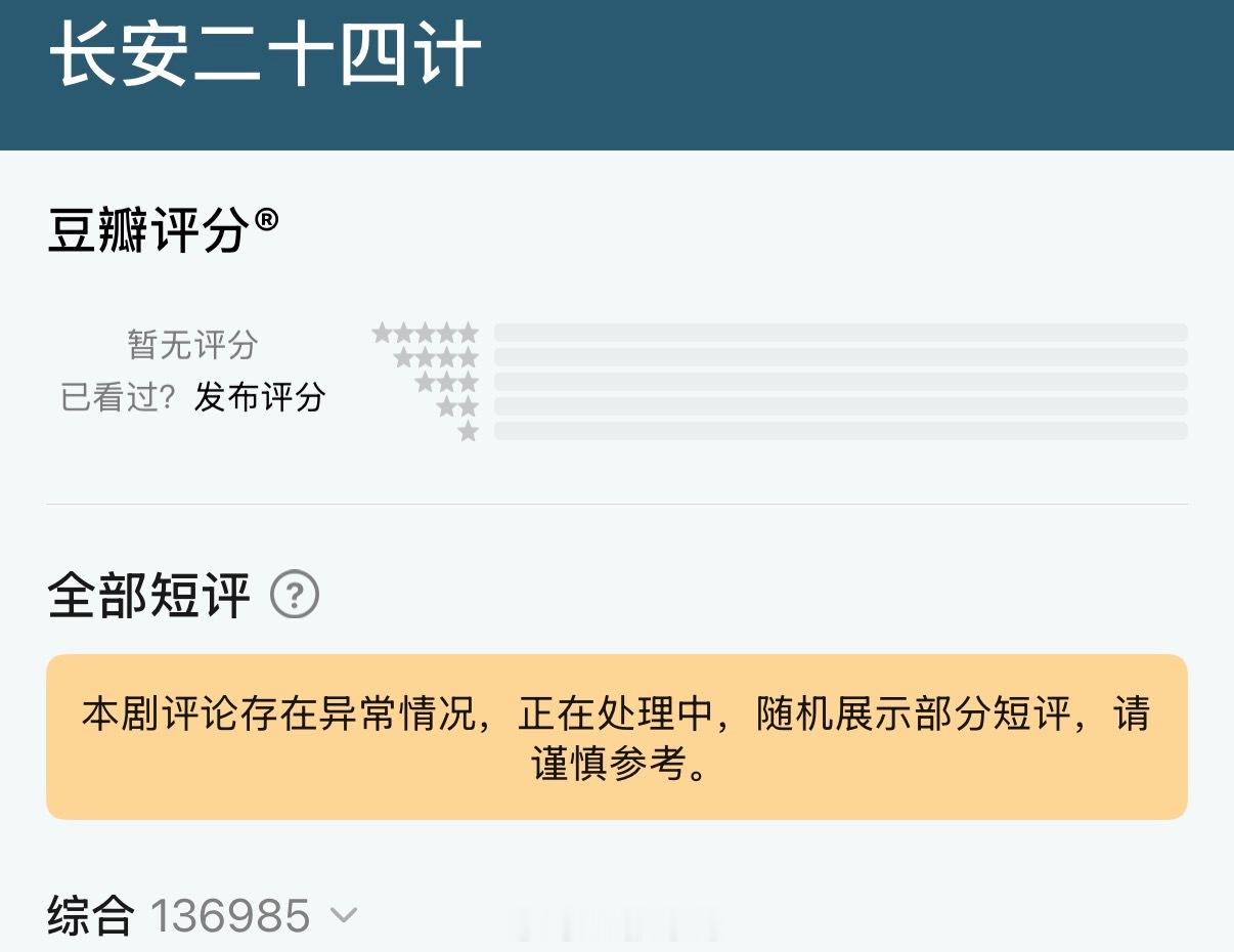 成毅新剧长安二十四计豆瓣评分界面显示:本剧评论存在异常情况,正在处理中……🙉长安二十四计豆瓣评论异常