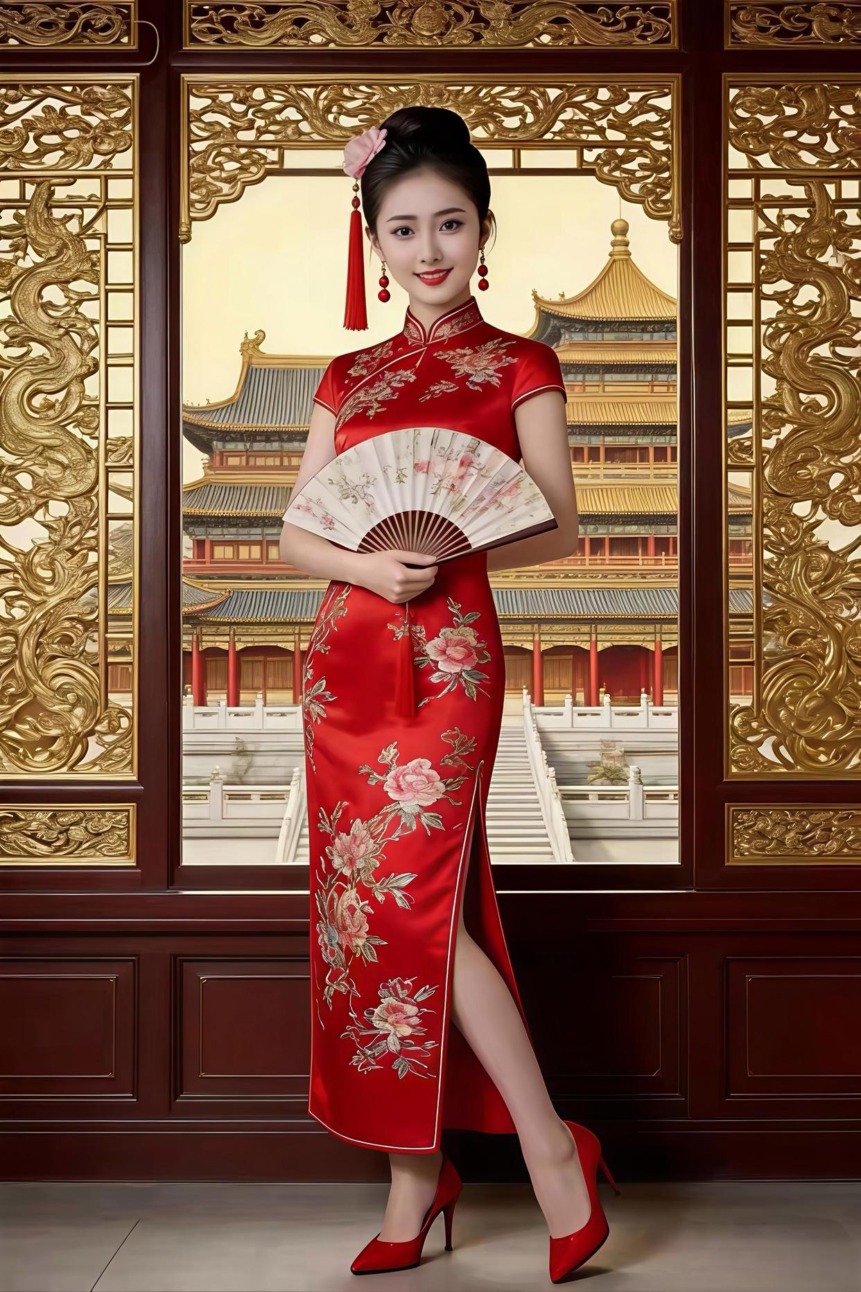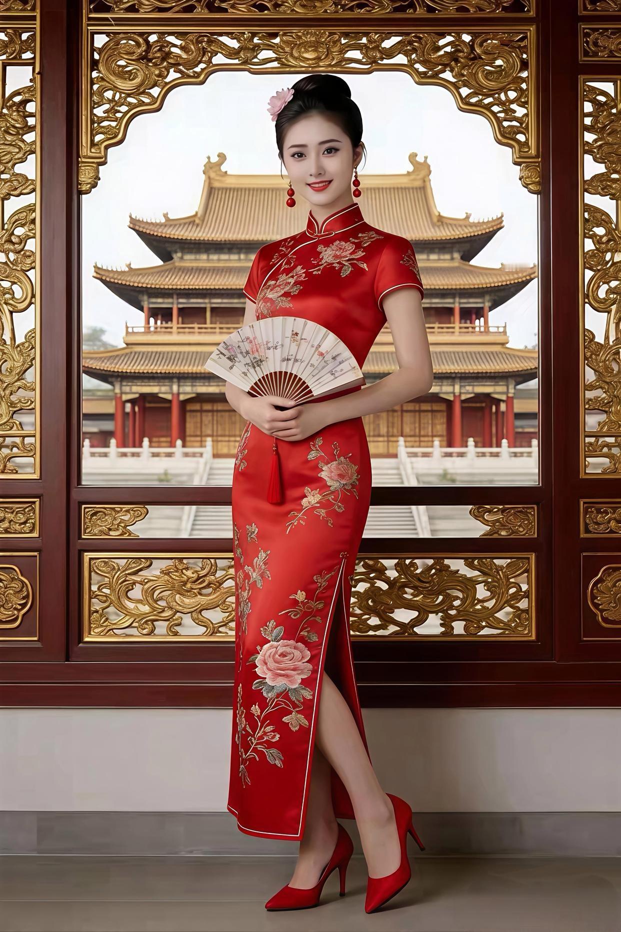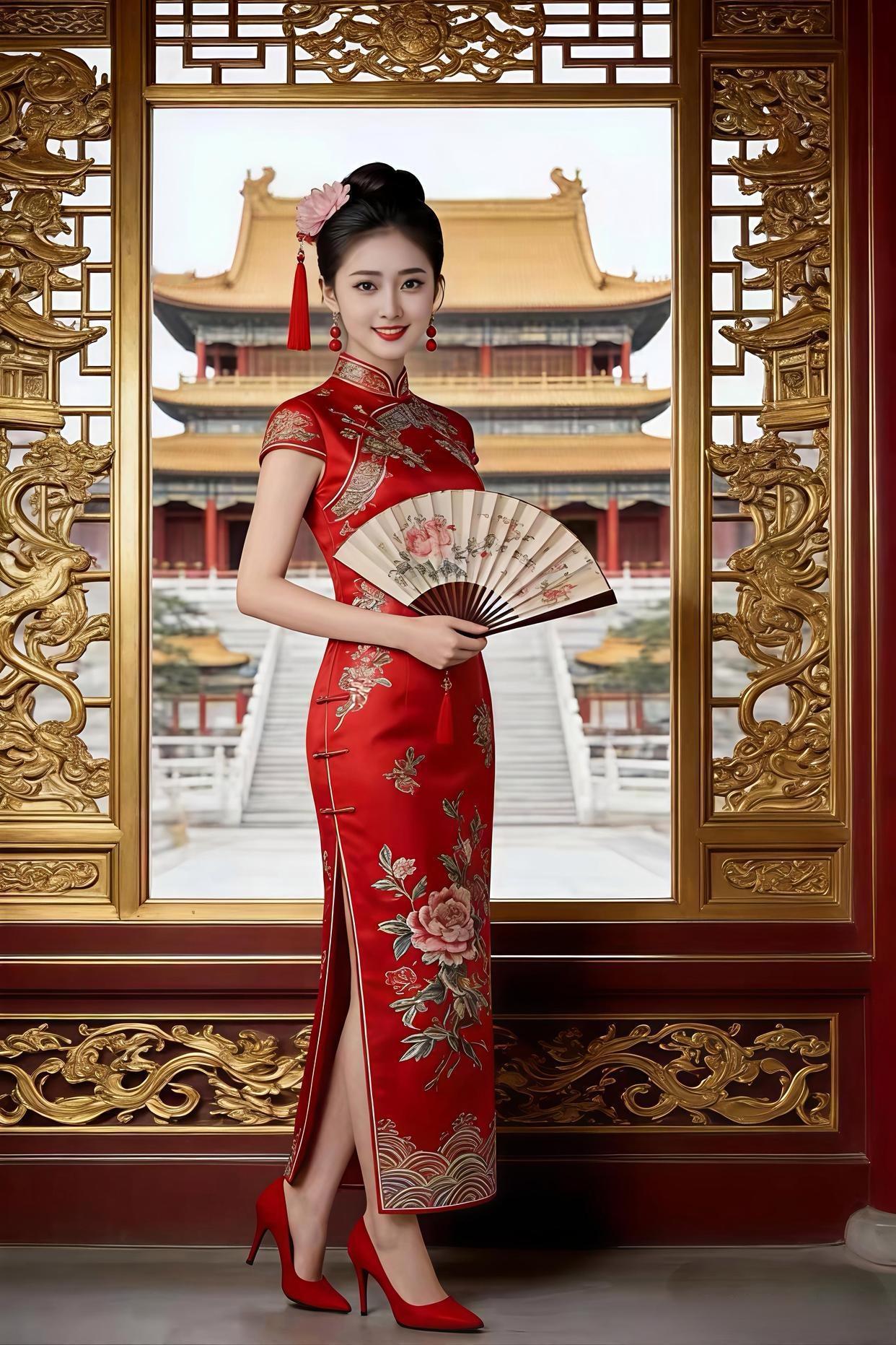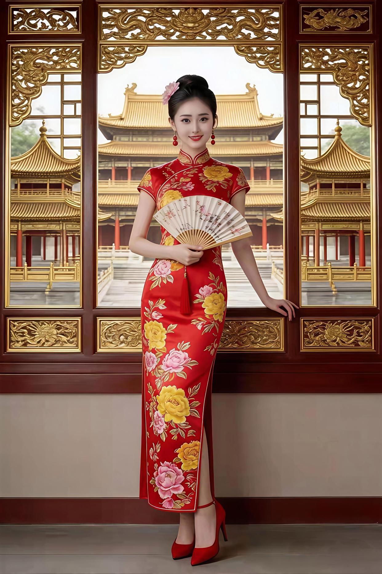 她立于鎏金窗棂前,一身正红缎面旗袍裁得风月入怀——绣面的牡丹如霞叠簇,金蕊粉瓣浸着流光,开得艳而不俗。斜襟盘扣挽住软玉腰肢,开衩处露的一截皓腕,与赤缎高跟鞋相衬,是古典里揉碎的摩登。