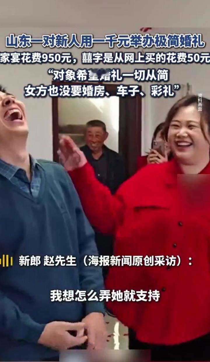 这婚礼太简单了,花了一千块钱!山东东营的这一对新人,新郎没穿礼服,新娘没穿婚纱,他们都穿的普通的衣服,但是都笑容满面得,看看新郎更是喜笑颜开,新郎说新娘子人很随和,他说什么是什么,这次婚礼什么都没有要,就连婚房,车子,彩礼都没有要,囍字还是从网上买的花了50块钱,家宴花费950元,一场婚礼下来花了一千元,天呐还有这么极其简单的婚礼,这新娘子真是过日子的好手。