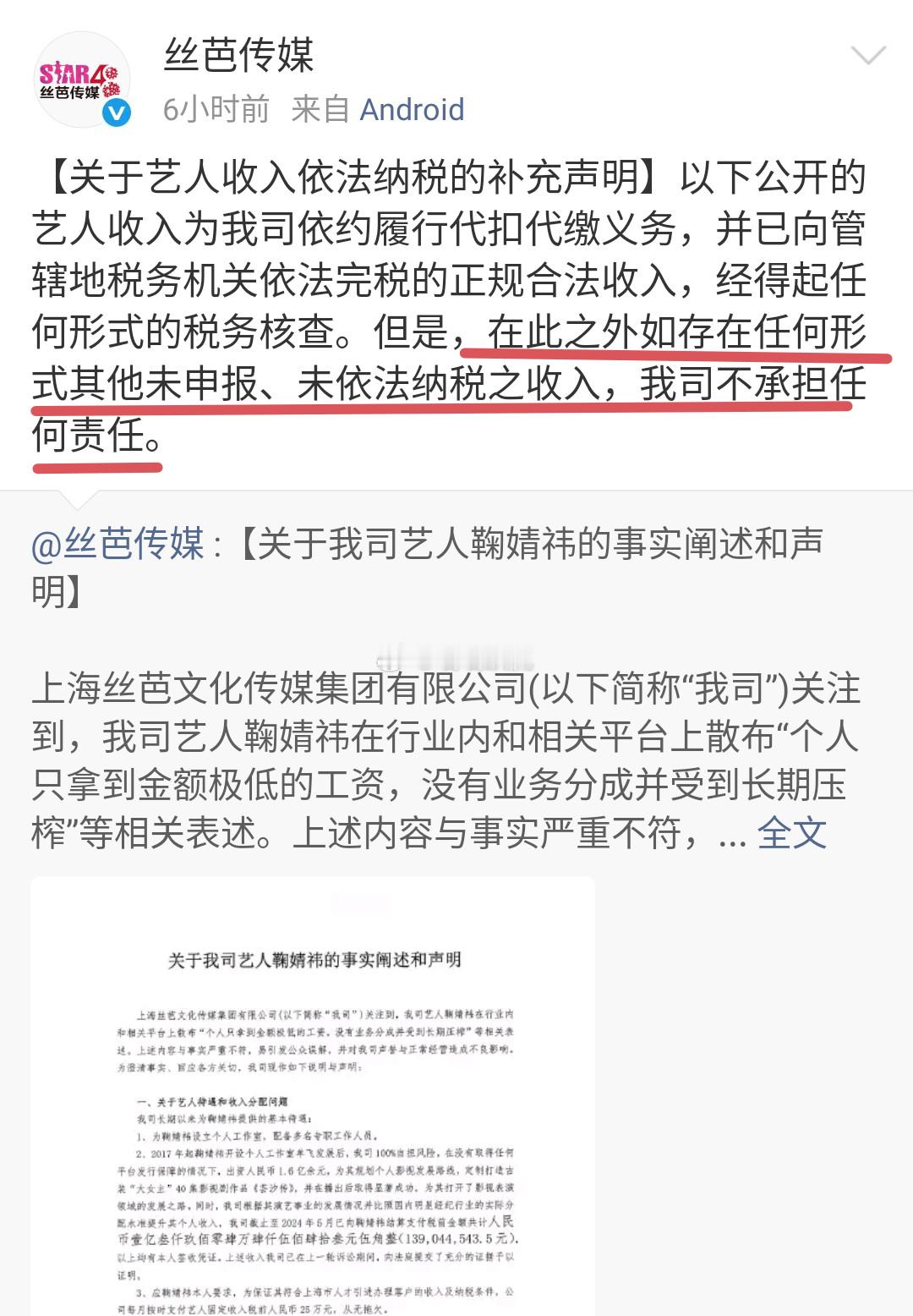 鞠婧祎宣布已是独立艺人丝芭传媒阴阳鞠婧祎丝芭传媒再次发文,说给鞠婧祎的费用都合法纳税了,但「此之外如存在任何形式其他未申报、未依法纳税之收入,我司不承担任何责任」