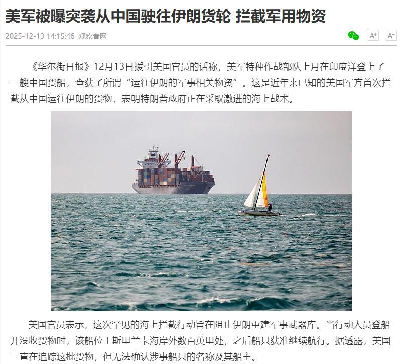 美国突袭检查中国开往伊朗的商船,特朗普简直是送上门的“神助攻”!   它这一查,直接给中国反制立了标杆——以后美国开往台湾的可疑船只,是不是我们完全可以依法登船检查!   2025 年 12 月 13 日,印度洋公海上演了一出霸权闹剧。   美国特种部队出动直升机和快艇,突然包围一艘行驶中的中国商船,目标直指这艘船运往伊朗的货物。   整个过程美方没提前跟中国打一声招呼,没出示任何确凿证据,更没获得船旗国同意,就强行登船检查。   登船后不仅粗暴翻查货物,还采集了船员的人脸、指纹等隐私信息,甚至销毁了部分他们口中所谓的 “可疑物品”,全程充斥着蛮横与无理。   美方对外宣称查获了 “军民两用部件”,可翻遍他们发布的所有声明,连一份能佐证说法的检测报告、一张清晰的货物照片都找不到。   这种空口无凭的指控,让人瞬间想起 2020 年的类似闹剧。   当时意大利配合美国扣押中国集装箱,一口咬定里面是军用无人机零件,结果开箱后全是风力涡轮机的普通配件,最后只能不了了之。   更讽刺的是,美国这次连最基本的国际流程都懒得走,完全无视《联合国海洋法公约》里关于公海执法的明确规定,把自己的国内制裁法案当成了 “尚方宝剑”。   这不是美国第一次对中国商船耍无赖。   32 年前的 “银河号事件”,同样是美方拿着莫须有的罪名,逼迫中国商船在公海漂泊数十天。船员们在缺水缺粮的困境里苦熬,最后美方查遍全船,连一点所谓的 “违禁品” 影子都没看到,却连一句像样的道歉都没有。   时隔这么多年,美国这种 “我怀疑你有罪,你就必须有罪” 的霸道逻辑,非但没有收敛,反而变本加厉,无非就是仗着自己海上军力强,想靠这种手段压制别人。   但这是不是意味着,以后美国的船,我国也可以登录检查?   数据显示,2024 年美国对台军售总额突破 40 亿美元,2025 年相关预算还在加码,大量武器装备都是通过这种隐蔽的商业运输渠道流入台湾。   美国一边在公海打着 “维护安全” 的旗号拦截中国商船,一边却忙着向中国台湾地区输送武器,这种一套规则两张脸的做法,全球各国都看在眼里。   美国这么折腾,说到底就是两个目的。   一是想切断中国和伊朗的正常经贸合作,遏制中国在中东地区的影响力;二是借着对台军售,不断试探中国的底线,妄想靠插手台海事务,牵制中国发展。   可他们千算万算,没算到自己这番操作,等于是亲手给中国的正当反制送上了合法依据。   国际交往讲究对等原则,你能以莫须有的理由在公海拦我的船,那以后遇到开往台湾的可疑船只,中国自然也能依法登船检查,维护国家主权和领土完整。   现在的中国,早就不是 32 年前那个面对霸权只能被动应对的国家了。   咱们的海警力量日益壮大,2025 年环台军演中,海警编队专门演练了登临检查、应急处置等科目,实战能力有目共睹。   而且国内有《反分裂国家法》《海警法》等一系列法律法规撑腰,每一次反制行动都有坚实的法理支撑。   中国和伊朗的经贸合作也不是美国想掐就能掐断的,2025 年两国双边贸易额突破 800 亿美元,能源、基建领域的合作更是根深蒂固,这是市场规律和双方需求决定的,不是美国的霸权行径能逆转的。   美国这种无理操作,看似是在耀武扬威,实则是给自己埋下了巨大隐患。   他们公然践踏国际法,把国内法凌驾于国际公法之上,这种做法已经引起了很多国家的不满。   德国、法国等美国传统盟友,近年来多次因为美国的单边制裁遭受巨额贸易损失,心里的怨气早就积攒了不少。   现在越来越多的国家看清了美国霸权的真面目,开始主动疏远这种只顾自身利益、无视国际规则的做法。   世界早就变了,不再是某个国家说了算的时代。   美国还想靠耍霸权在海上横行霸道,注定是行不通的。   中国从不惹事,但也绝不怕事。美国亲手立的这个 “标杆”,只会成为中国维护自身权益的合法参考。   那些妄图破坏国际规则、分裂中国领土的势力,最终只会搬起石头砸自己的脚。   海权不是霸权,未来的海洋,属于坚守规则、互利共赢的国家,霸权横行的日子,终究一去不复返了。