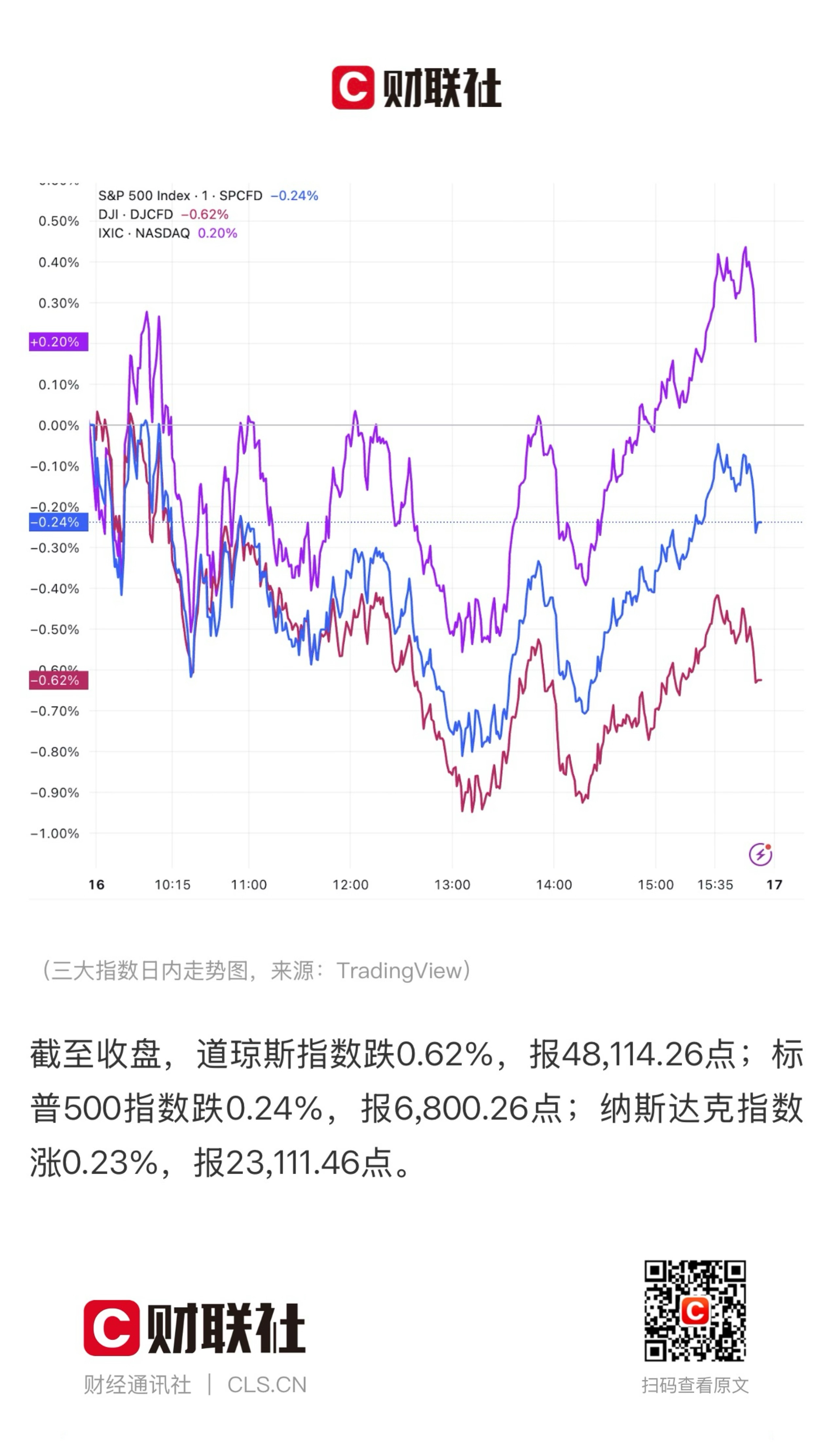 【美股收盘:三大指数涨跌不一 特斯拉创历史新高】 (财联社 2025-12-17 06:03 ) 『 要点:① 三大指数涨跌不一,仅纳指小幅收涨; ② 大型科技股普涨,特斯拉涨超3%,创历史新高; ③ 热门中概股多数下跌,纳斯达克中国金龙指数跌0.34%。 』 财联社12月17日讯 美东时间周二,三大指数涨跌不一,仅纳指小幅收涨,标普500指数连续第三个交易日下跌。 截至收盘,道琼斯指数跌0.62%,报48,114.26点;标普500指数跌0.24%,报6,800.26点;纳斯达克指数涨0.23%,报23,111.46点。 周二盘前公布的数据显示,美国11月新增就业6.4万人,略高于市场普遍预期的4.5万人。但10月就业人数减少了10.5万人,11月失业率也升至4.6%,高于市场预期的4.5%,创四年多来新高,引发市场对美国经济状况的担忧。 最新就业数据公布后,市场对美联储下月降息的预期并未发生变化。芝商所美联储利率观察工具显示,1月再次降息的可能性仍然不大,依然为24%,与前一日持平。 Bolvin Wealth Management Group总裁Gina Bolvin表示:“今天的数据描绘了一幅经济暂时喘口气的图景。就业增长仍在维持,但裂痕正在显现。消费者仍在支撑经济,但已无力加速。这种组合让美联储在不引发恐慌的情况下拥有更大的政策转向空间,也让投资者有理由更关注高质量资产、收益型资产和长期主题,而不是短期噪音。” 特斯拉涨超3%,创历史新高。特斯拉市值也借此超越博通,成为美国市值第七大公司。 ▪️ 热门股表现 大型科技股普涨,英伟达涨0.81%,苹果涨0.18%,微软涨0.33%,谷歌跌0.54%,亚马逊涨0.01%,Meta涨1.49%,特斯拉涨3.07%,博通涨0.44%,甲骨文涨2.02%,奈飞涨0.85%。 热门中概股多数下跌,纳斯达克中国金龙指数跌0.34%,阿里巴巴跌0.53%,拼多多跌1.25%,网易跌1.85%,京东平收,百度涨0.40%,蔚来汽车涨0.80%,小鹏汽车涨0.87%,理想汽车涨0.24%,哔哩哔哩跌0.53%,腾讯音乐跌0.62%,小马智行涨7.28%。 ▪️ 公司消息 • 苹果据称计划到2027年秋季将其iPhone产品线从五款扩展至七款 据多名直接参与苹果及供应商产品工作的消息人士透露,未来两年,苹果计划大幅扩展智能手机产品线,2027年秋季前可能发布至少七款新的旗舰机型。 首款可折叠iPhone预计在2026年秋季发布,据多名参与该项目的人士称,这款设备展开时宽度大于高度,外形像一台小号iPad。 其他拟发布的产品包括:2026年春季将推出的iPhone 17e(名字待定)、2026年秋季将推出iPhone 18 Pro和Pro Max,2027年春季发布iPhone 18、iPhone 18e(名字待定)、iPhone Air 2(名字待定)、以及20周年纪念版iPhone 20(名字待定)。据悉20周年纪念版将取消黑色边框并扩大屏幕尺寸,苹果计划将前置摄像头置于屏下,使其成为首款无挖孔、真正的“全屏”iPhone。 • 英国调查谷歌是否在广告技术领域涉嫌反竞争行为 12月16日,英国竞争与市场管理局(CMA)称正在调查谷歌是否通过其在广告技术领域的行为滥用市场支配地位。 • Coinbase注册地已迁至美国得克萨斯州 Coinbase当地时间12月15日公告称,本公司从美国特拉华州重新注册为得克萨斯州公司的程序已于2025年12月15日生效。公司重组并未导致业务、职位、管理层、财产、任何公司办公室或设施的所在地、雇员人数、义务、资产、负债或净值发生任何变化。 • 辉瑞预计2026年营收595亿美元至625亿美元 12月16日,辉瑞发布2026年全年指引:预计营收595亿美元至625亿美元,预计调整后每股收益2.80美元至3.00美元。 • 摩根士丹利:特斯拉Robotaxi车队2026年有望增至1000辆 摩根士丹利预计,随着技术和监管方面的重要节点达成,特斯拉将在2026年大幅扩充其Robotaxi车队。该行指出,在奥斯汀开展的无安全员监督测试是对特斯拉战略的关键验证,也是近期最重要的催化剂。摩根士丹利预测,得益于安全指标的持续改善以及2026年4月Cybercab的投产,特斯拉Robotaxi车队规模将从目前的寥寥数辆增至2026年的约1,000辆。 网页链接