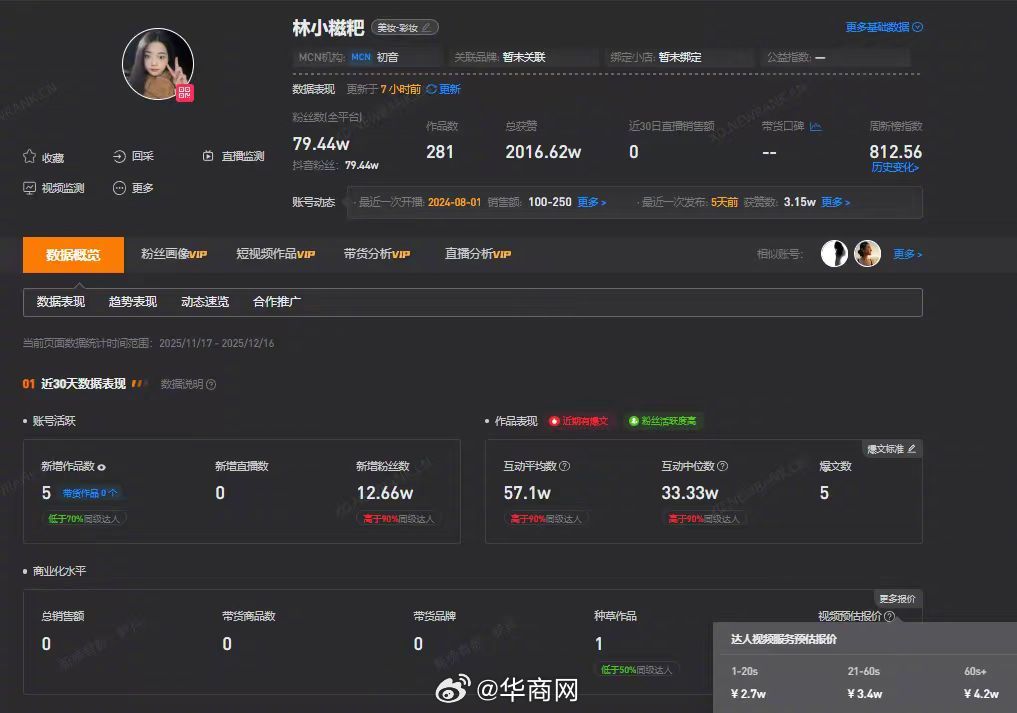 【#脑瘫女孩60s广告报价4.2万#】#脑瘫女孩抖音30涨粉12.66万# 近日,#脑瘫女孩3年帮家里还债40余万# 冲上热搜。据媒体报道,脑瘫女孩“林小糍粑”每拍摄一期视频,需要一早就开始化妆,做完造型凌晨两点,独自剪辑视频需要一两天的时间。查询第三方数据平台发现,网名“林小糍粑”实名信息“林玲”抖音粉丝79.5万,1-20秒视频报价为2.7万元,21-60秒视频报价为3.4万元,1分钟及以上视频报价为4.2万元,近30涨粉12.66万。