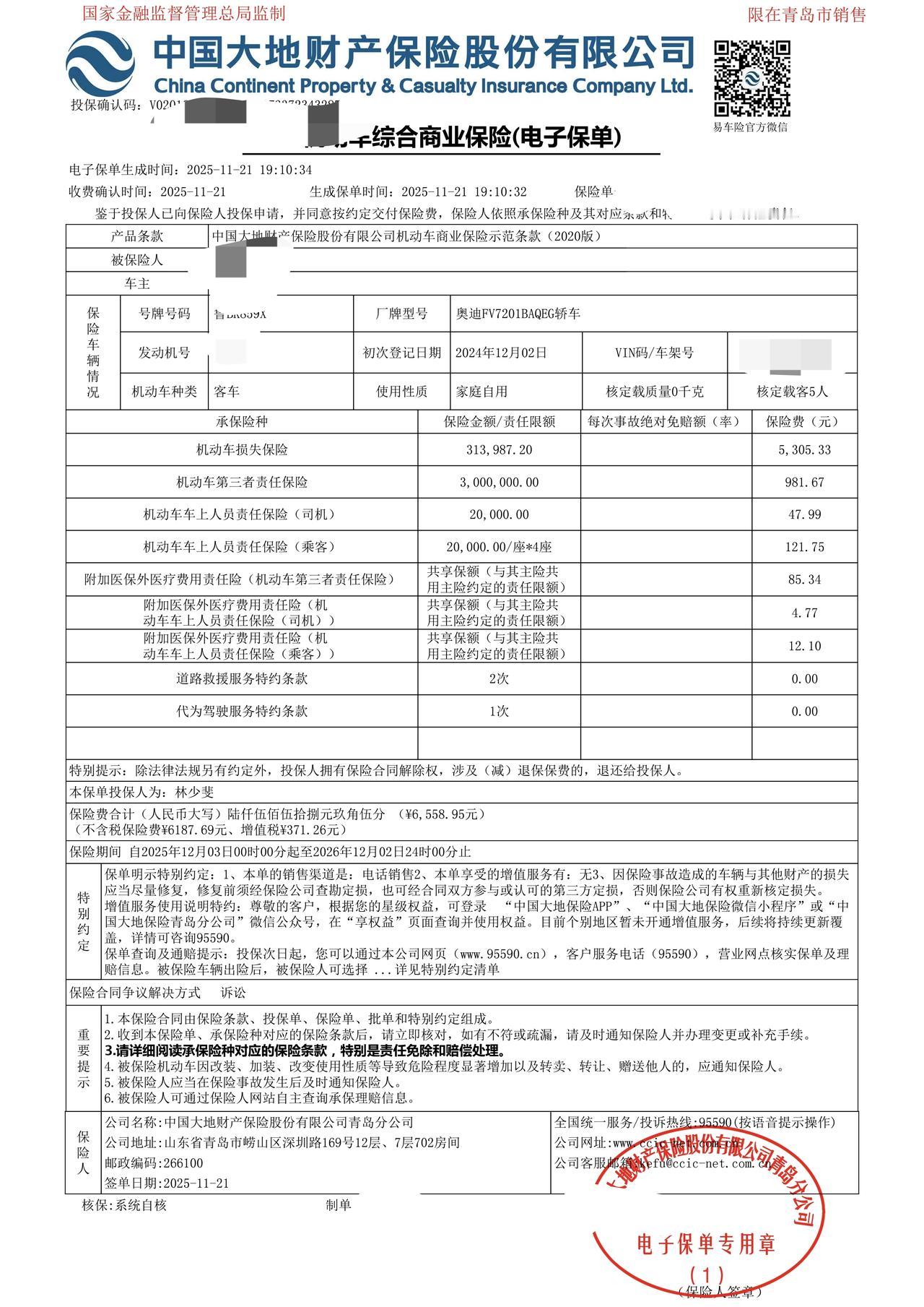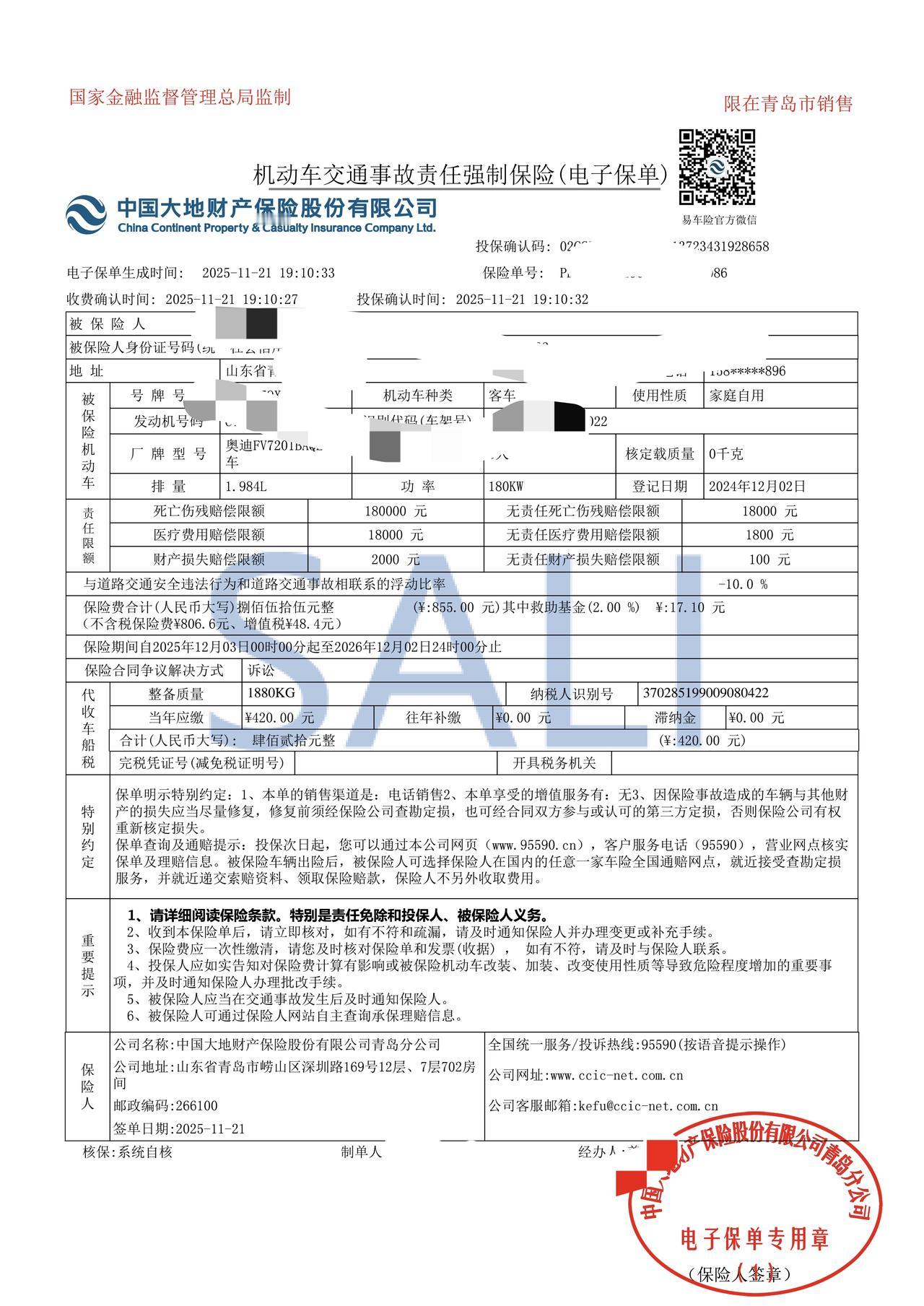 不知不觉间,大六子已经陪伴我有一年的时间了,要不是看到了一汽奥迪App的流量已到期,都不知道时间过得那么快,在十一月份的时候,就有不少车险推销员疯狂的打电话,推销自家的车险,贵的有将近九千的,便宜的也得六千多块钱,跟网上说的第二年保费只有五千块钱差的太远了。今天就来聊一聊我的大六子第二年的保费吧。 ①交强险 大六子的交强险是855元,这个顾名思义,是必须要买的险种,不然的话你的车是不能上路的。 ②车船税 车船税是420元,但凡是涉及到缴税的,那都是必须要交的,区别就在于你是自己交还是保险公司代缴,区别不大,固定金额的税种,让保险公司代缴还能省下不少时间。 ③车损险 车损险的费用还是有很大出入的,从各种报价单中发现,保额不一样,价格也是从5200到5800左右不等,相差得有六七百块钱,所以这里还是要看清楚价格,避免被坑。 ④三者险 我选的是三百万的三者险,毕竟常年跑高速和国道,保额好一点还是比较放心的。就像我姐,平时都是在市区转悠,她就选了二百万的三者险,两者相差二三百块钱,我的是980,她的二百万的是680左右,主要看你的用车环境,选择合适的保额。 ⑤医保外责任险 这个险种很便宜,我的是85块钱,建议还是要买上,虽然很多自媒体说不买的话,保险公司也是给赔付的,但是为了防止扯皮,节省时间,买了! ⑥驾乘险 我的是司机加乘客总共220块钱左右,虽然搞不懂有什么作用,但是销售也是很强硬的给捆绑销售了,也就没有再过多的纠结这个问题。 ⑦附加险 我的这个附加险是安行如意保意外险,我最排斥的一种保险,可以说是霸王条款也不为过,但是为了那个返现,不得不捏着鼻子认了,也就六百块钱,但是整个保险下来,可以返现一千多块钱,还是划算的。 总结 七项保险下来,总共在八千块钱左右,然后返现一千五,最终价格在六千五百块钱,相比较其他保险的报价还是便宜了不少的,至于跟网上的五千块钱相比,差距还是很大的。但是我真的是磨不下来价格了,也是真的尽力了。[捂脸][捂脸][捂脸] 【请到“懂车帝APP”查看投票】