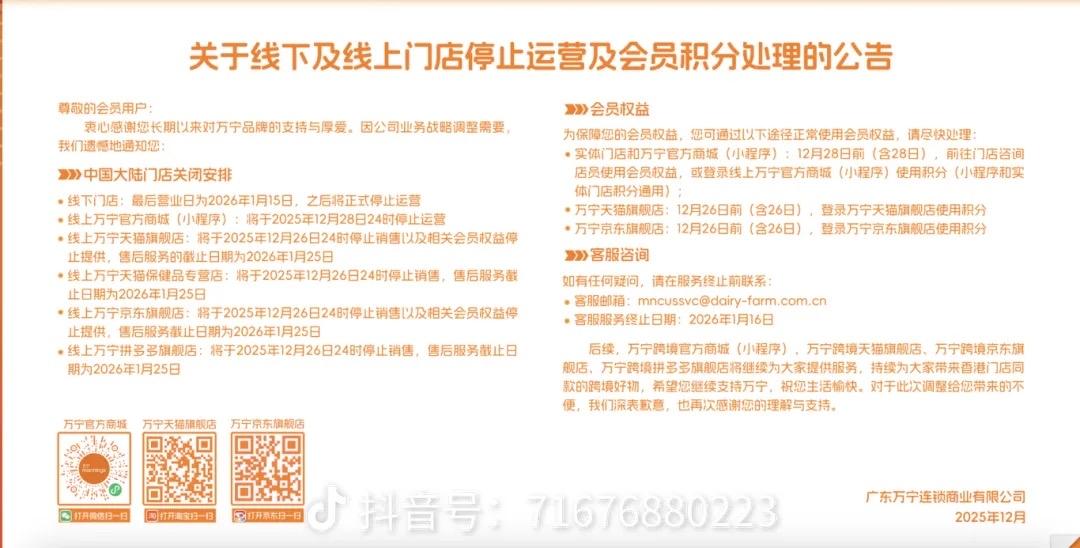 今天路过家附近万宁, 门口贴满闭店通知, 查了下竟是真事!万宁已官方官宣,内地所有线下门店明年1月15日全闭店,天猫、京东旗舰店本月26日就停售,小程序28日也关停,陪伴多年的港货小店要彻底撤了~ 现在不少门店已经清仓打折,货架都空了大半,看着真挺唏嘘的,毕竟是很多人买日用品、药妆的老地方。不过后续还能走跨境渠道买同款,就是再也没线下逛店的感觉了。你常去万宁囤啥?评论区聊聊你的回忆~