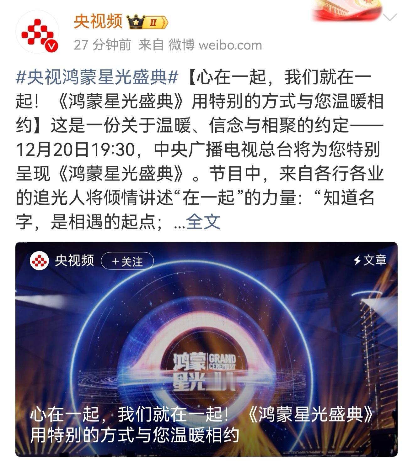 虽然延期,但终究还是来了12月20日19:30,中央广播电视总台将为您特别呈现《鸿蒙星光盛典》