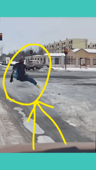 堪称经典的摔跤, 干脆利索不拖泥带水! 冰冻的路面干净整洁瓷实, 防护穿戴齐整完备, 小心翼翼浅走两步, 呲溜一滑, 双腿前翘、 上半身迅速下落, 闷响一声, 稳稳落地, 没溅起一丝冰花!