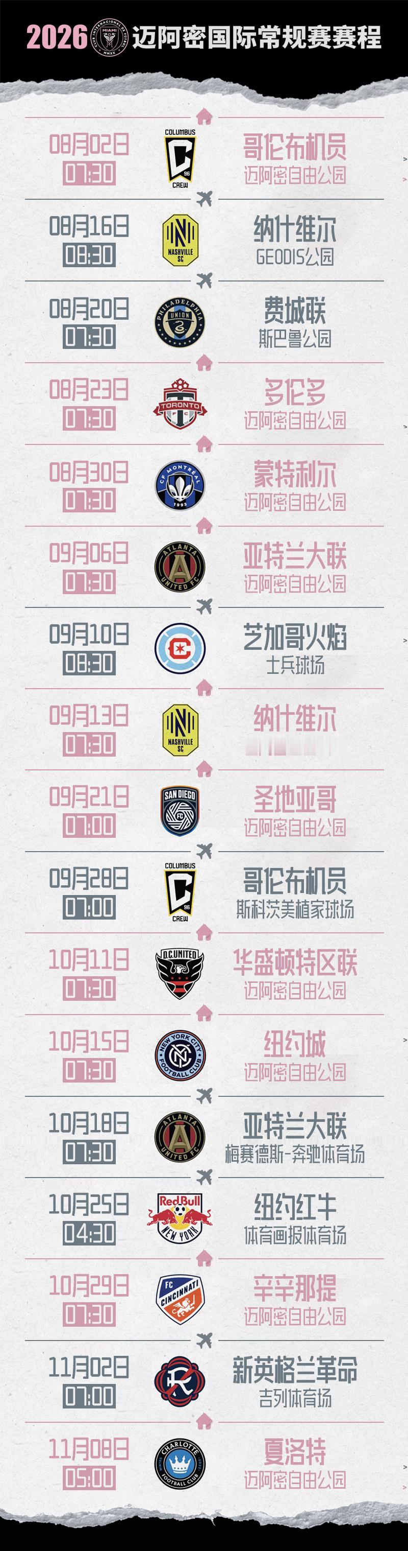 📢注意注意:好久没做图啦,最近犯懒了🫠久违的迈阿密国际2026常规赛赛程已出(都是北京时间)4月5号会来到新球场自由公园🏟对阵泰勒所在的队伍欢迎自取🥳就不加水印了梅西