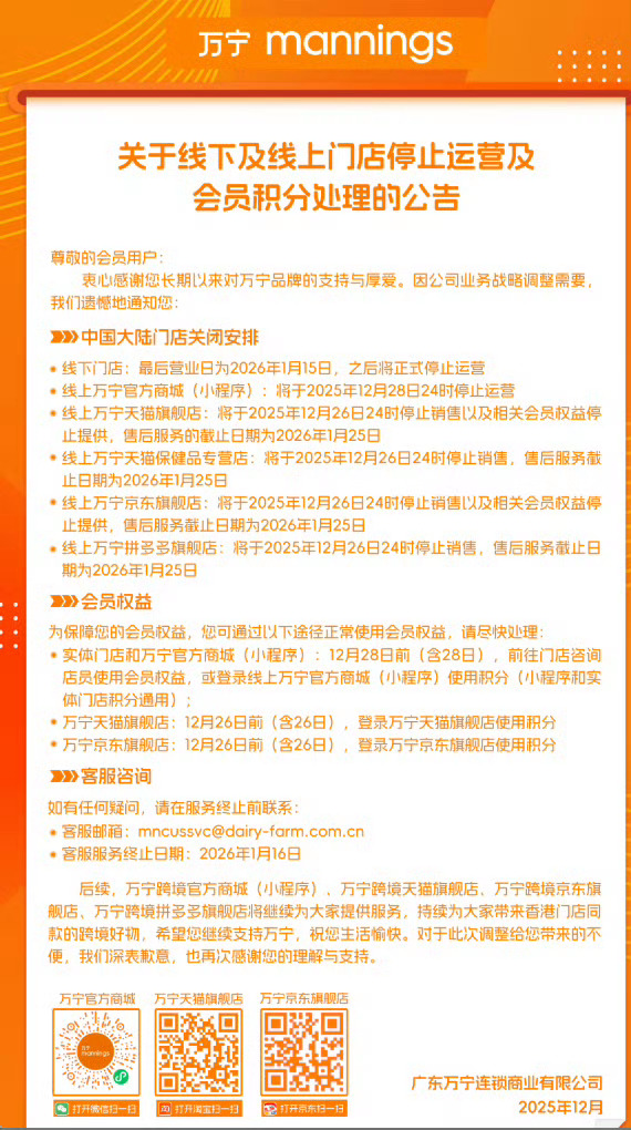 万宁关闭内地所有门店一点也不意外,年轻人不爱的品牌,终究没有持久的生命力。不过万宁关掉内地所有店,像一家开了二十年的网吧突然关门,还是有点感慨。当年可是“港澳正品药妆”的代名词,很受欢迎。现在年轻人买护肤品:查成分、直播间抢券、海淘APP直邮。说白了,它输给的哪是对手,是时代。渠道权威被算法拆解,地域光环被物流抹平,专业背书被博主 消解。连我妈都学会比价了,那些靠“帮你挑”赚钱的生意,自然没得玩。曾经高大上的零售模式,最后安静离场。挺好的,时代往前跑的时候,本来就不会回头打招呼。分析:【万宁关闭内地所有门店 】万宁宣布关闭内地所有门店 12月16日,记者自万宁中国官网获悉,药