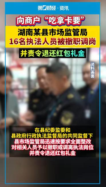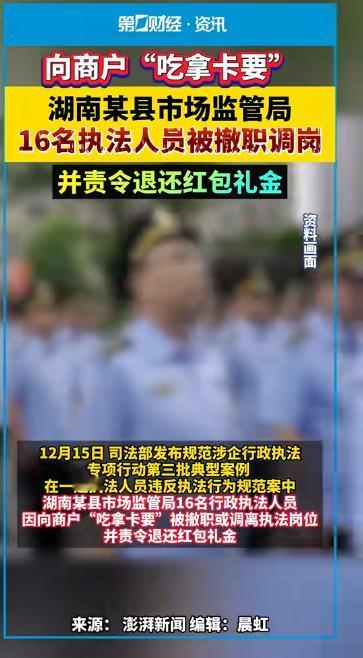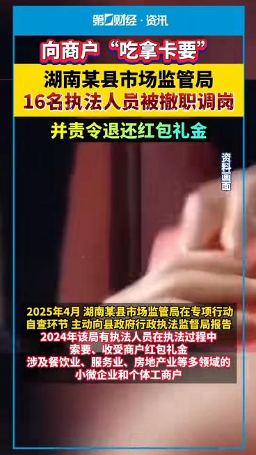 让人瞠目结舌!16名执法人员因“吃拿卡要”被撤职调岗!网友:披着“合法”的制服干着不法的勾当,比地痞流氓可恶一万倍!   湖南一则通报,揪出执法队伍“害群之马”,十六名市场监管执法人员,因向商户“吃拿卡要”,被直接撤职、调岗,此消息一经公布,网友纷纷拍手称快,彰显民众对公正执法的期盼。   今年四月,当地开展专项行动自查,发现问题后,立即向县政府行政执法监督局呈报一起内部问题,自查报告内容披露,着实令人惊愕不已。   早在 2024 年,该局就有部分执法人员,把手中的执法权当成了 “敛财工具”,他们在日常检查时,专对餐饮业、服务业、房地产业的小微企业与个体工商户“开刀”,此类商户规模甚小、抗风险力弱,面对执法检查本就谨小慎微,唯恐惹上事端。   有商户吐槽,执法人员上门检查,明明没什么大问题,却故意挑刺、拖延时间,话里话外还暗示 “给点意思事情就好办”,逼着商户掏红包、送礼金,才能 “求个平安”。   一次检查能反复上门好几回,不给钱就迟迟不给解决问题,一位商户无奈地说,本来做生意就不容易,这些额外的 “负担”,让他们苦不堪言,慢慢也对执法部门失去了信任。   这些执法人员的行为,可不是个别现象,调查发现,涉及多次、多名人员,完全把执法纪律抛到了脑后,也让市场监管部门的公信力大打折扣。 县政府行政执法监督局接到线索后,立刻展开调查,工作人员走访了 20 多家商户,核实账目、调取相关记录,一点点还原事情真相。 最终这十六名人员都受到了应有的处罚,相关部门依法依规作出决定,对他们予以撤职、调岗等处分,同时还在全局开展警示教育,要求大家举一反三,彻底整改执法作风问题。 通报一发布,网友们议论纷纷,有人说,“吃拿卡要” 看着金额可能不大,但对小商户来说,就是实实在在的压迫,更是破坏了公平执法的环境,也有人点赞当地部门,觉得主动自查、及时纠错,是对权力监督的积极信号。     执法权是用来维护市场秩序、保护商户合法权益的,不是用来谋私利的,一旦权力失去约束,受损的不只是商户的利益,更是政府的形象和社会的公平,只有让执法在阳光下运行,持续强化监督,才能让市场环境更清朗,也让做生意的、过日子的群众,都能真正安心。 信息来源 :第一财经
