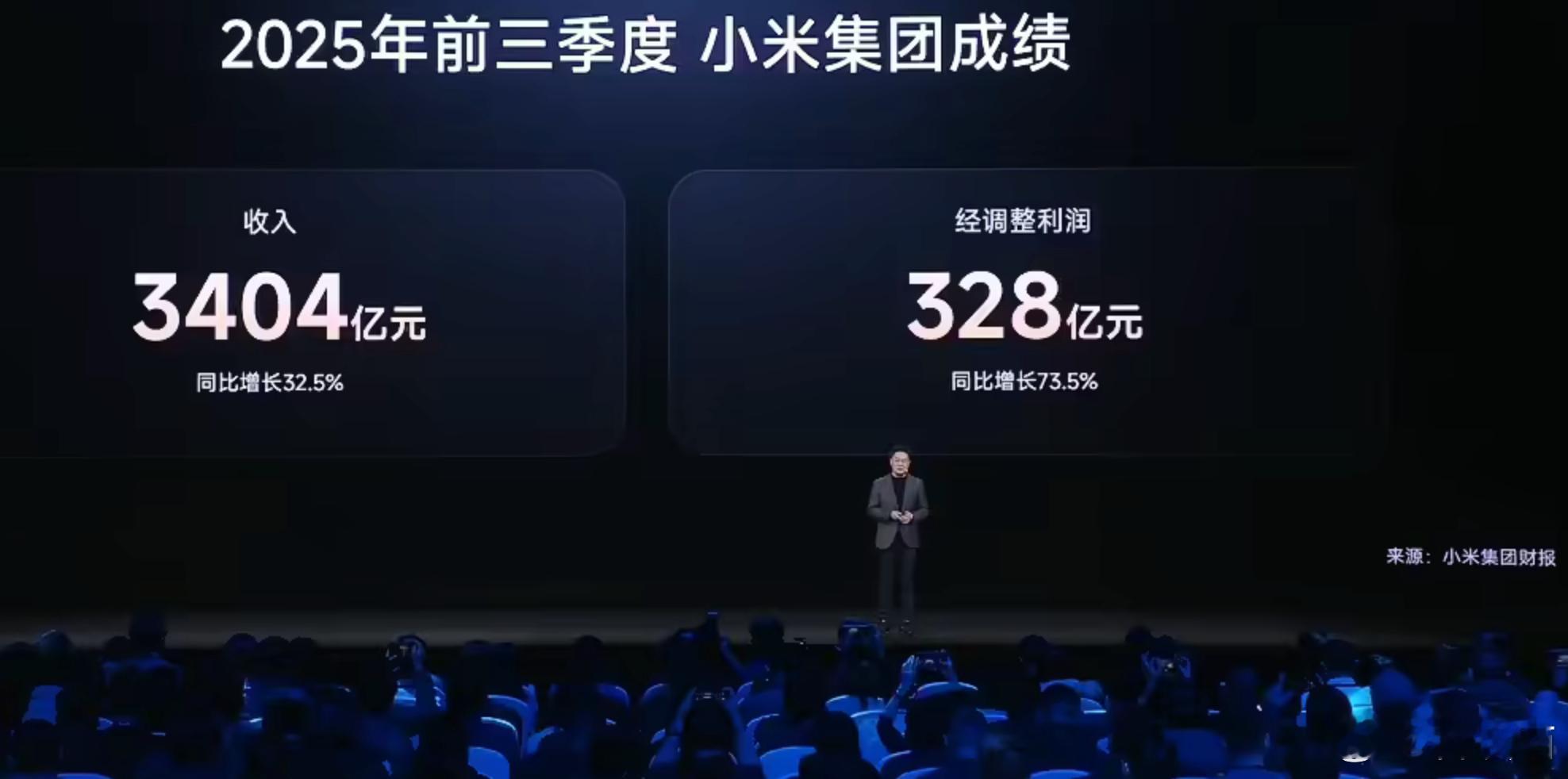 小米集团 2025 年前三季度收入 3404 亿元,同比增长 32.5%;经调整利润 328 亿元,同比增长 73.5%。平均每天净赚1.2亿